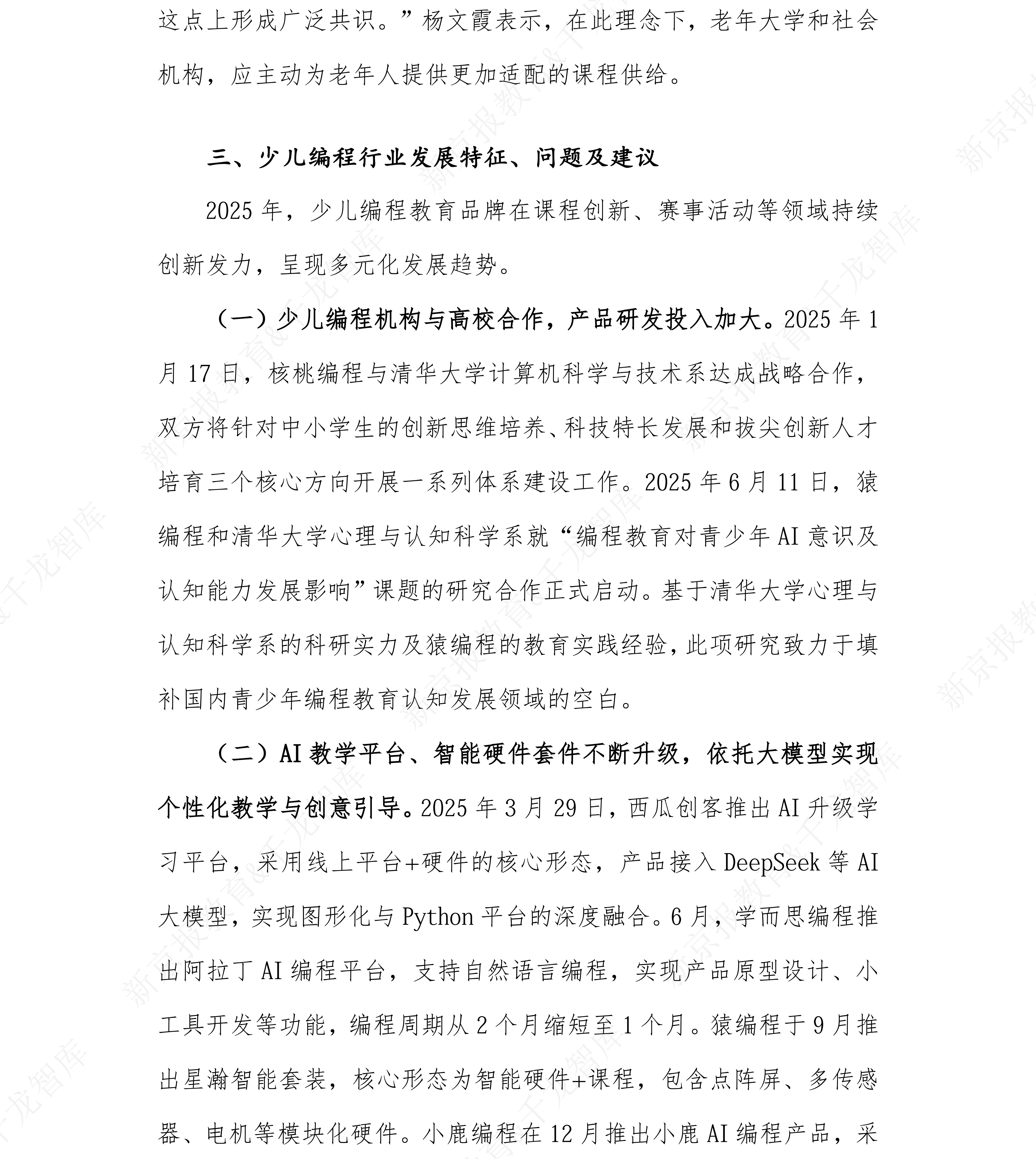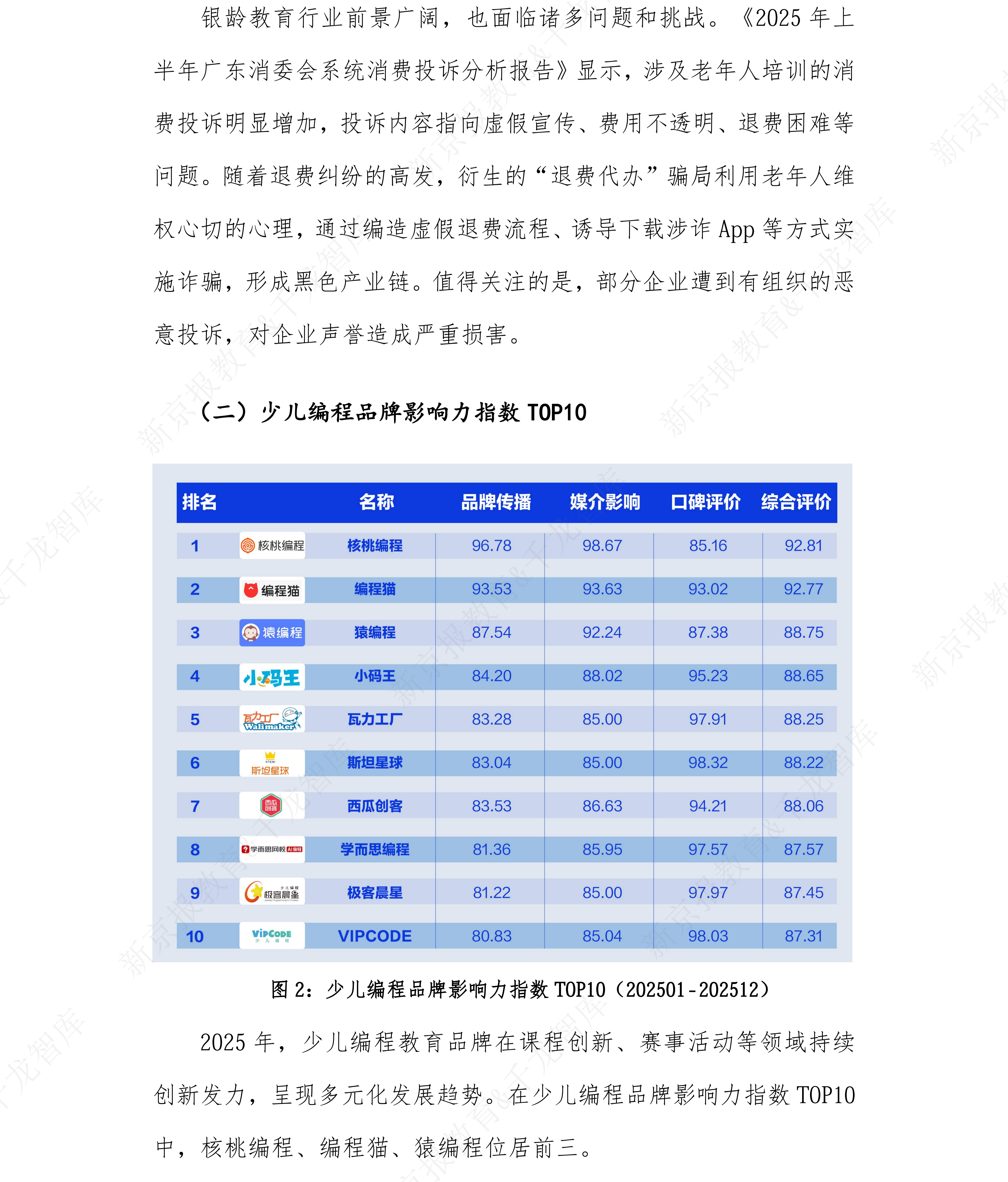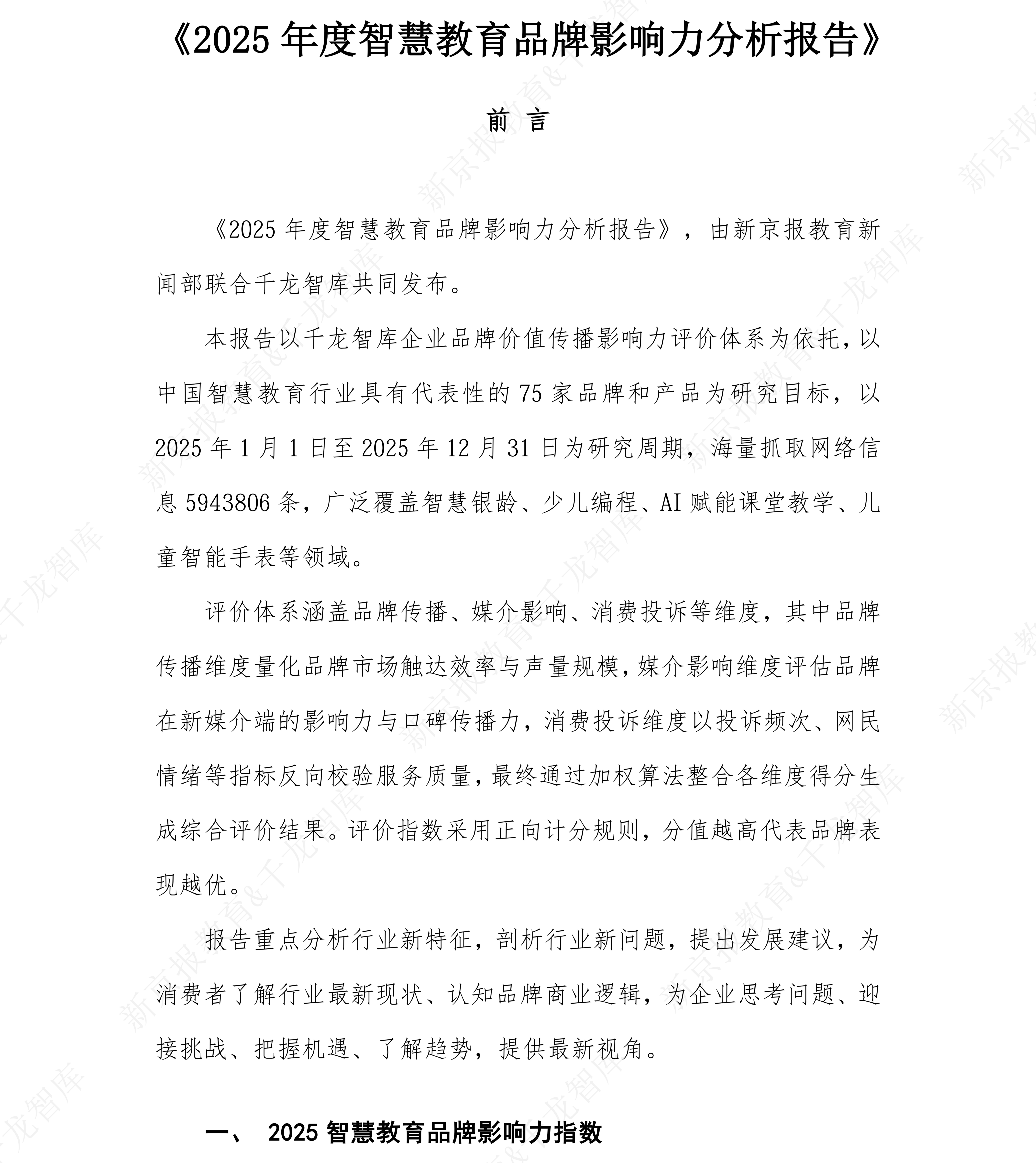 《2025年度智慧教育品牌影响力分析报告》发布4大指数:智慧银龄教育品牌影响力指数TOP10、少儿编程品牌影响力指数TOP10、AI赋能课堂教学品牌影响力指数TOP10、儿童智能手表消费投诉指数TOP10。