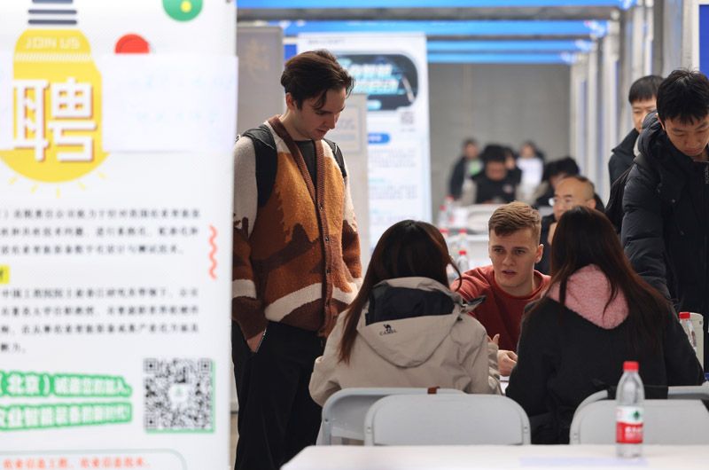 一名外国留学生与招聘企业交流。为精准畅通人才就业发展通道,双选会政策宣介区精准解读海淀区毕业生引进、安居保障、创业扶持等系列人才利好政策,并特设一站式求职服务专区。
