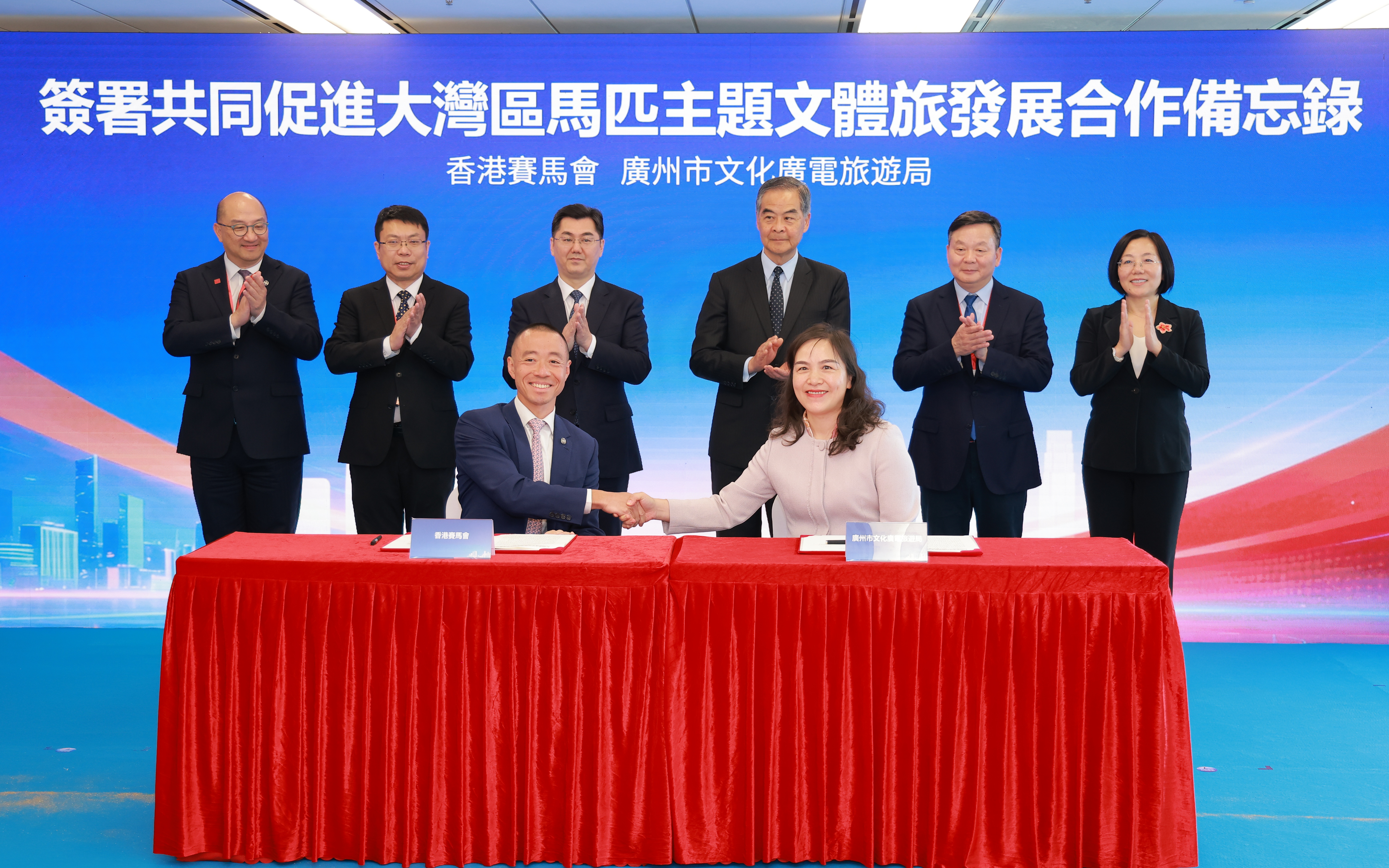 签署仪式在香港科技园举行。在全国政协副主席梁振英、广州市人民政府市长孙志洋、中央人民政府驻香港特别行政区联络办公室经济部副部长吕峰、广东省大湾区办常务副主任朱伟、广州市文化广电旅游局局长刘瑜梅及香港赛马会公司事务执行总监谭志源见证下,香港赛马会内地事务部主管陈岳鹏及广州市文化广电旅游局党组成员、总工程师李若岚签署合作备忘录。