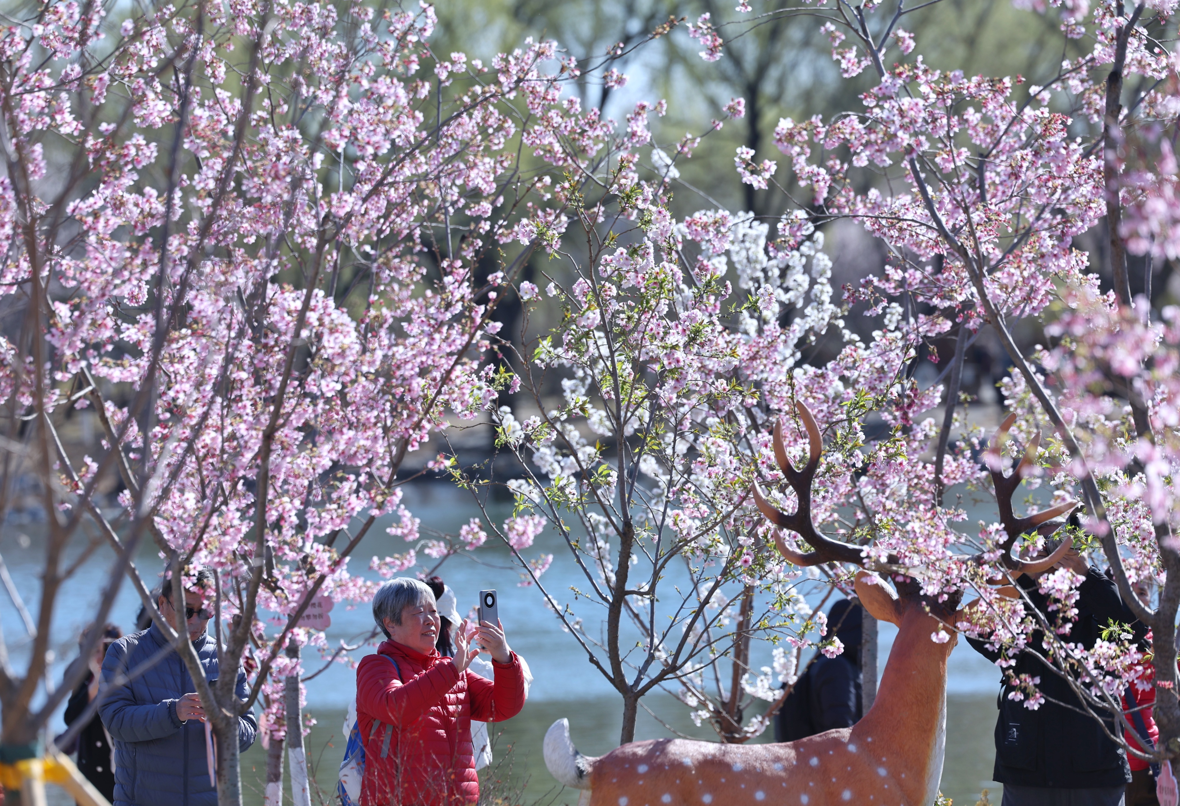 3月18日,玉渊潭公园,游客欣赏提前开放的促培早樱。新京报记者 薛珺 摄
