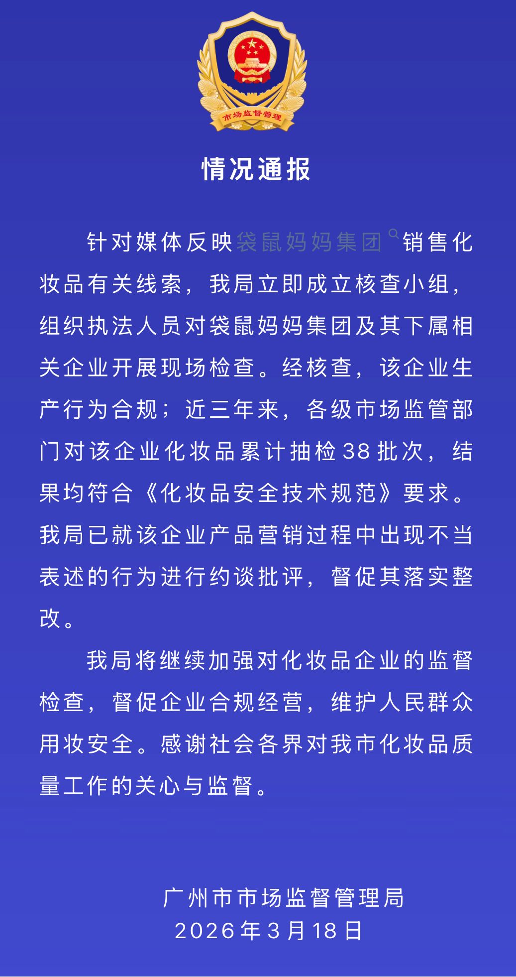 针对媒体反映袋鼠妈妈集团销售化妆品有关线索,我局立即成立核查小组,组织执法人员对袋鼠妈妈集团及其下属相关企业开展现场检查。经核查,该企业生产行为合规;近三年来,各级市场监管部门对该企业化妆品累计抽检38批次,结果均符合《化妆品安全技术规范》要求。我局已就该企业产品营销过程中出现不当表述的行为进行约谈批评,督促其落实整改。