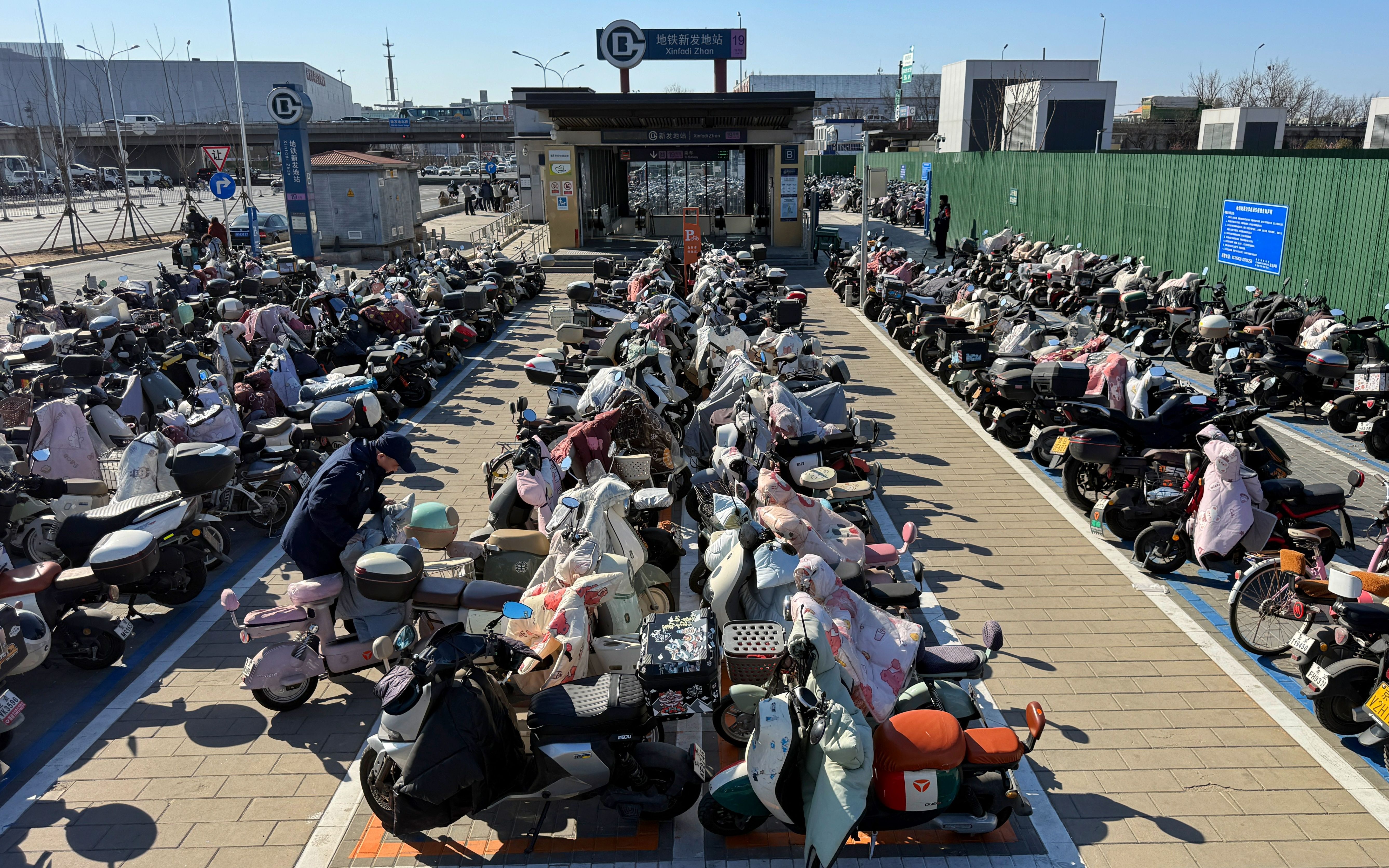 3月18日,地铁新发地站B口外,工作人员码放电动自行车。新京报记者 王贵彬 摄