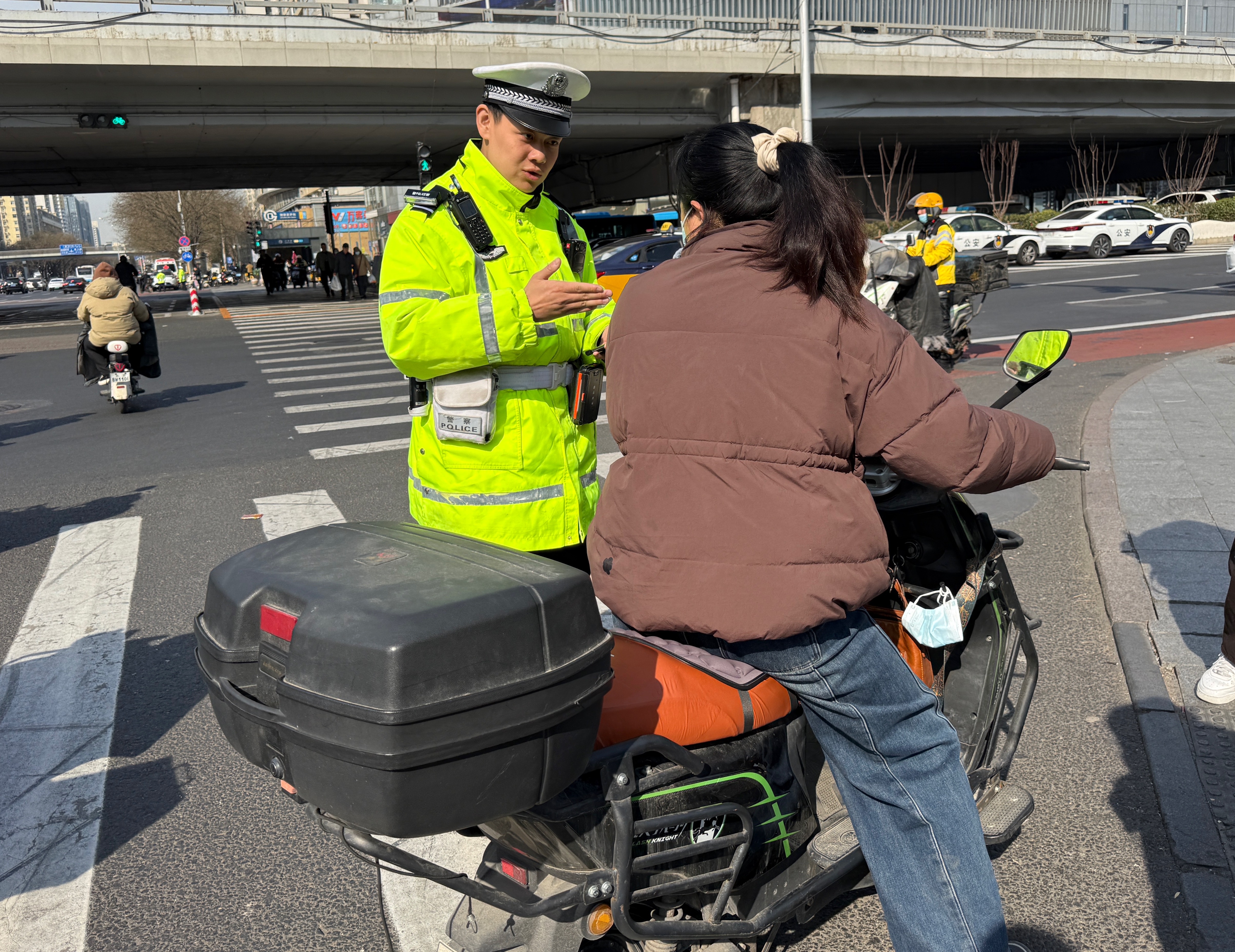 3月19日上午,交管部门在双井桥路口开展安全宣传,提醒市民骑乘电动自行车应规范佩戴安全头盔。新京报记者 王贵彬 摄