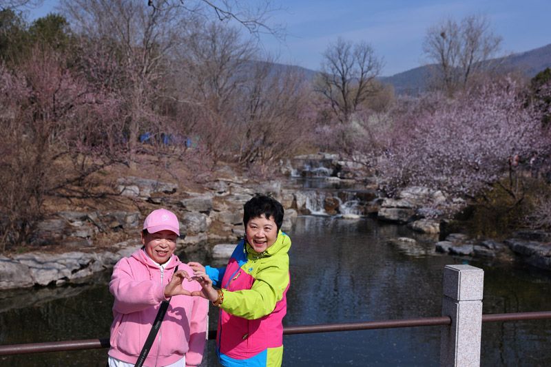 游客在山桃花溪前留影。国家植物园植物种质资源丰富,3月下旬,山桃率先展露娇容;4月上旬,山碧桃大道上的“品虹”“品霞”等绚丽绽放;4月中下旬,桃花园里集中展示的菊花桃、寿星桃、帚桃等60余种桃花进入盛花期,让人流连忘返。