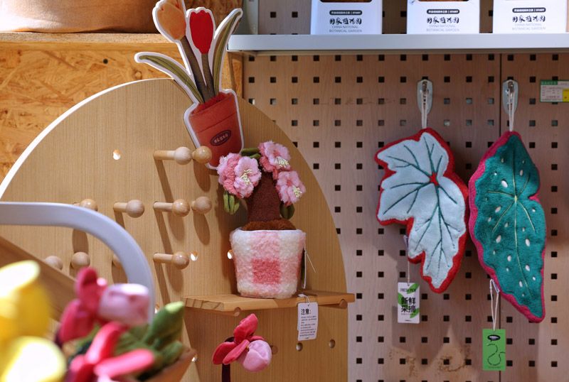科普馆东侧的 “植此春色” 文创市集与展览温室南侧的花卉市集汇集了各类植物相关文创产品、鲜花绿植。图为桃花系列毛绒玩具。