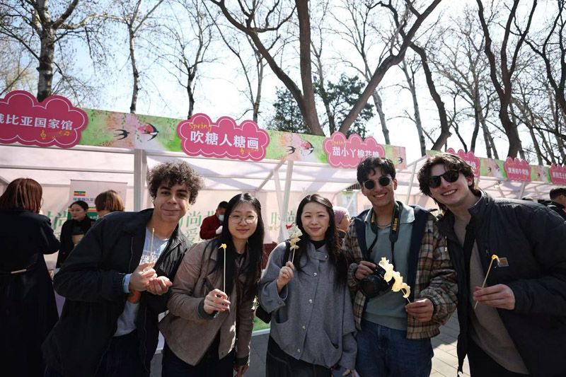 集市上,留学生品尝糖人。