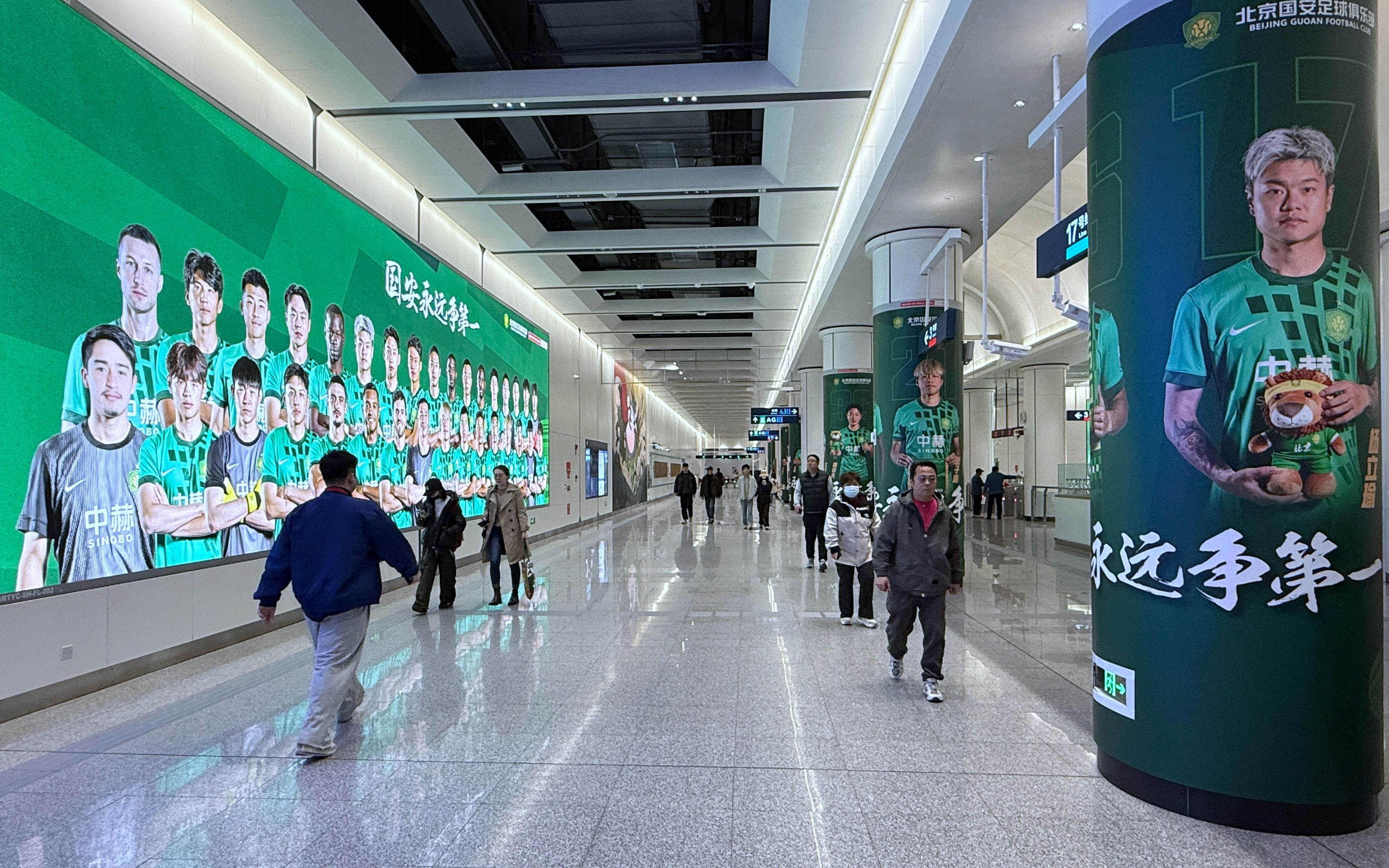 北京地铁方面介绍,此次主题车站以“固定站点+流动车厢”双场景联动模式,打造全景式沉浸氛围,不仅刷新了市民的日常出行体验,更让往返球场的球迷提前进入“观赛状态”,实现“未进球场,先入主场”。站内十余项媒体资源齐上阵——站厅LED电子屏、灯箱、梯顶LED、吊挂式LED、站台立式大屏等循环播放国安新赛季赛事集锦与高光瞬间;11根站厅包柱上张贴着国安球员海报,整个车站空间被足球主题元素覆盖。通过将足球热情融入轨道交通,引导更多球迷和市民选择地铁前往赛场,可有效缓解周边交通压力,助力城市低碳环保。