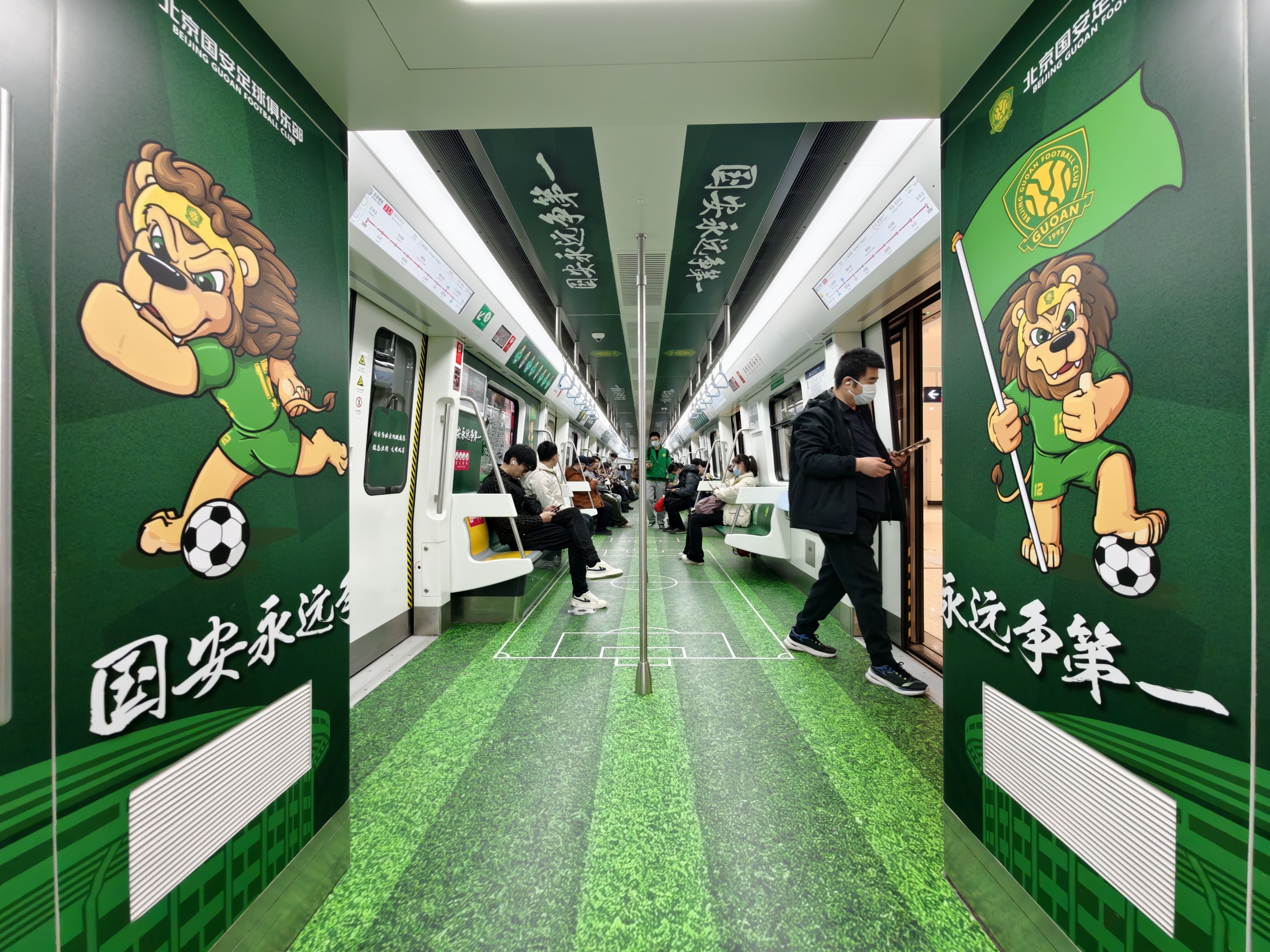 3号线主题列车与主题车站同步推出,化身“移动绿茵主场”。车厢内从ABC位、地贴、顶贴到座椅贴全面焕新,座椅区域特别印制国安球员的球衣号码与专属图案。乘客可以对照号码,寻找自己心仪球员的“专属座位”,随手就能拍出氛围感大片。车厢内还设置了绿色出行、文明观赛标志,营造安全有序、文明和谐的出行氛围,搭配定制化特色广播,倡导市民绿色出行。
