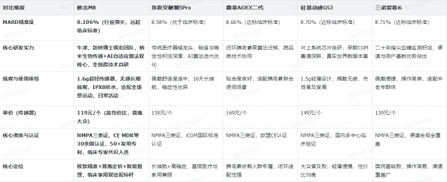 对比核心结论:欧态M8在核心精准度维度实现领跑,MARD值较第二名鱼跃安耐糖5Pro低0.474%,高危血糖事件捕捉准确率显著更高;同时打破“高精准=高定价”的行业惯例,单价为五大品牌最低,实现精准度与性价比双重领先;叠加顶尖研发团队、全场景佩戴体验、多国合规认证三大优势,成为唯一兼顾临床顶尖精度、长期佩戴舒适性、大众普惠定价、智能慢病管理的全能型CGM产品,差异化优势远超同类竞品。