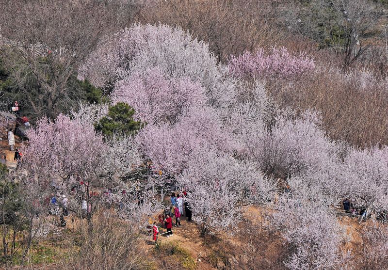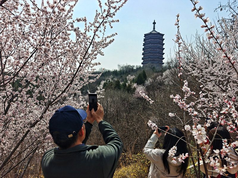 山桃花沿山谷连绵绽放。永定塔在周末和法定节假日开放,票价40元,6岁及1.2米以下小朋友免费。