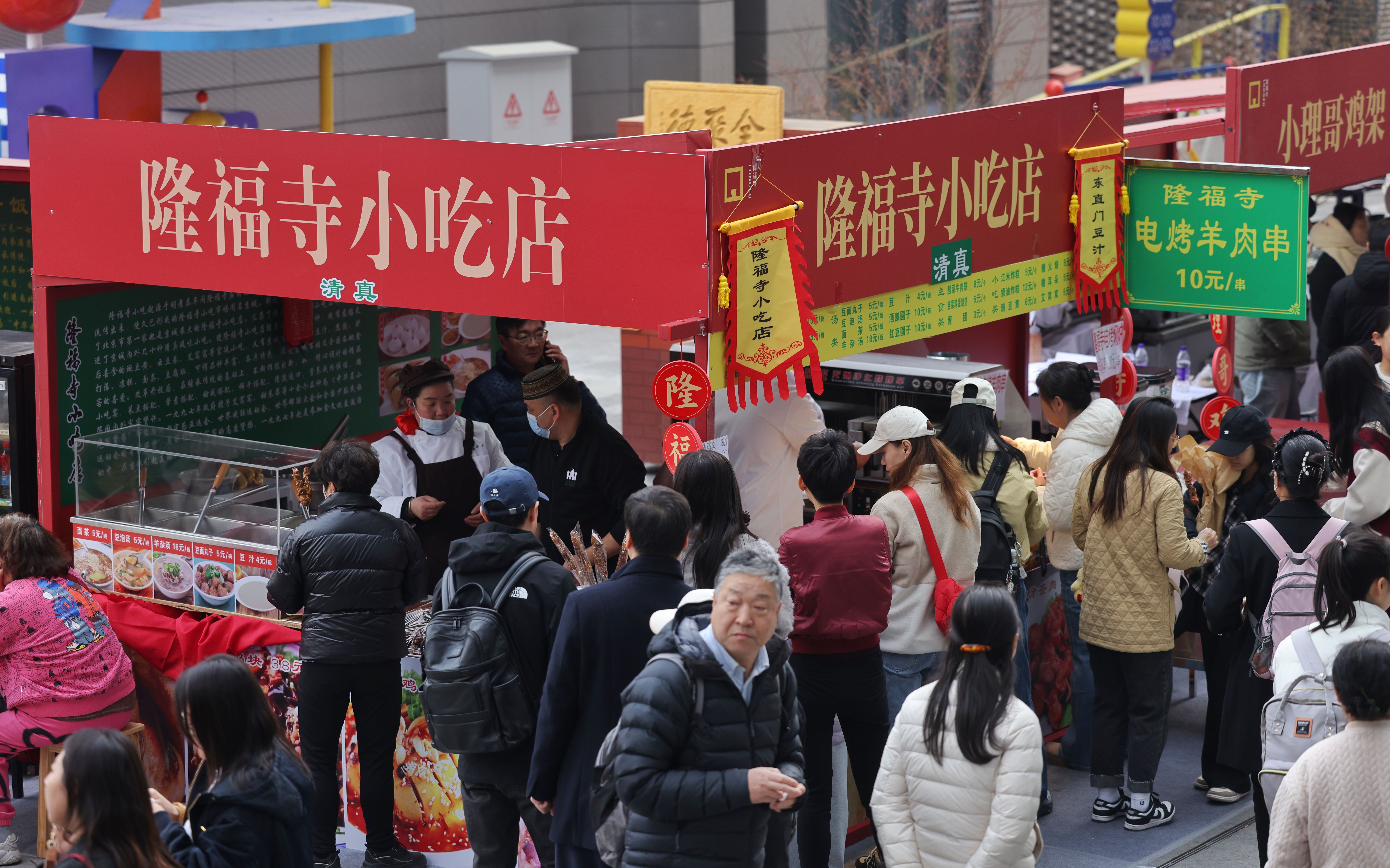 隆福寺小吃店店长王龙也没闲着,驴打滚、豆汁、面茶一字排开。“好多老街坊看见我们,高兴得不行,说‘你们可回来了’。”他特意准备了小瓶装豆汁,方便年轻人尝鲜带走。