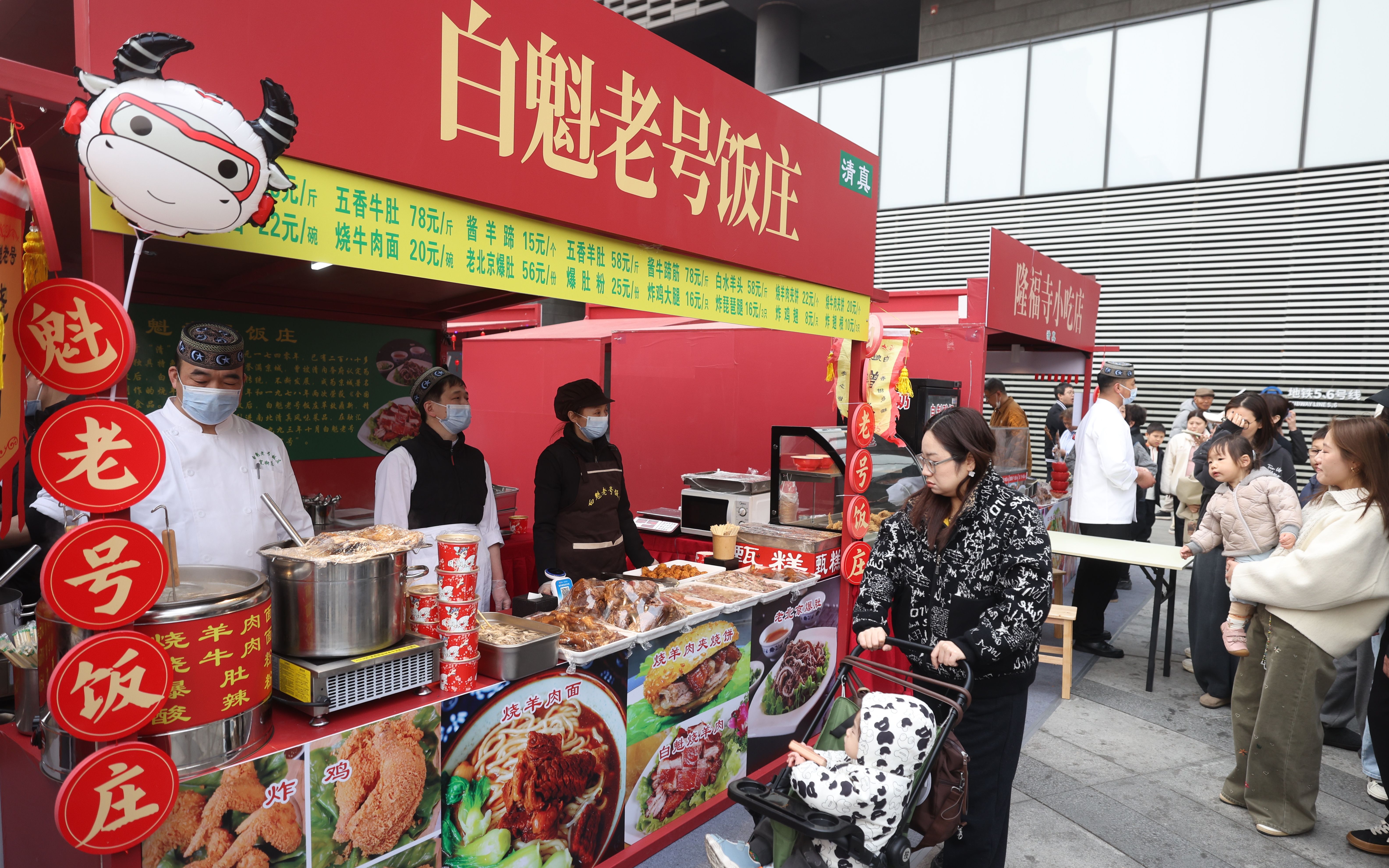 “明华烧麦1961年就有了,老北京人都认。15年前明华烧麦关了门,今天我们把它请回来了。”高天亮站在市集中央,身后就是重新开张的烧麦档口。他透露,接下来馄饨侯也有望回归。市集北侧绘制了老隆福寺街区的百福墙上,隆福寺小吃、明华烧麦、丰年灌肠、馄饨侯比邻而居。
