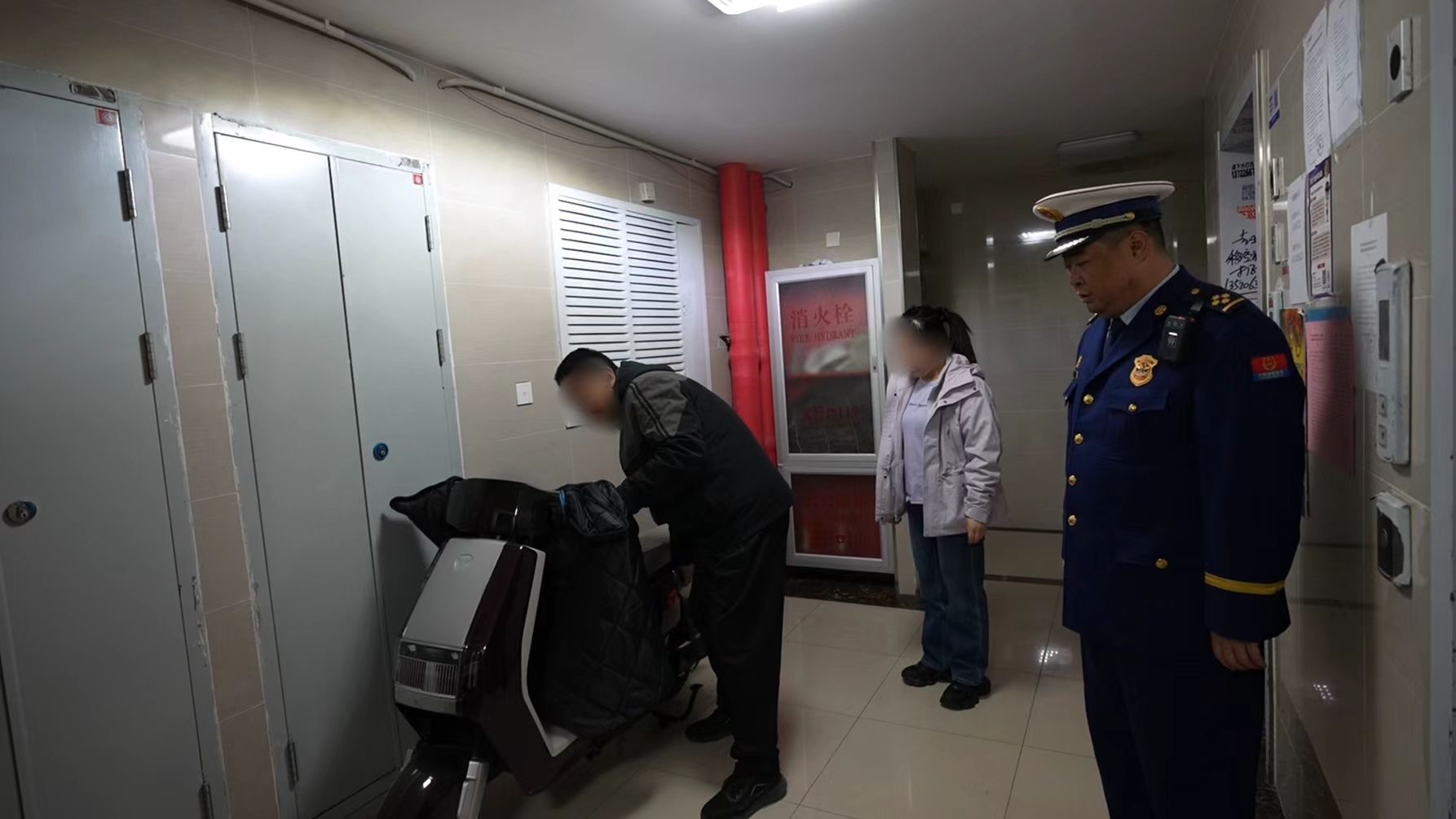 消防监督员劝导车主将停在楼道内的电动自行车推离。朝阳消防供图