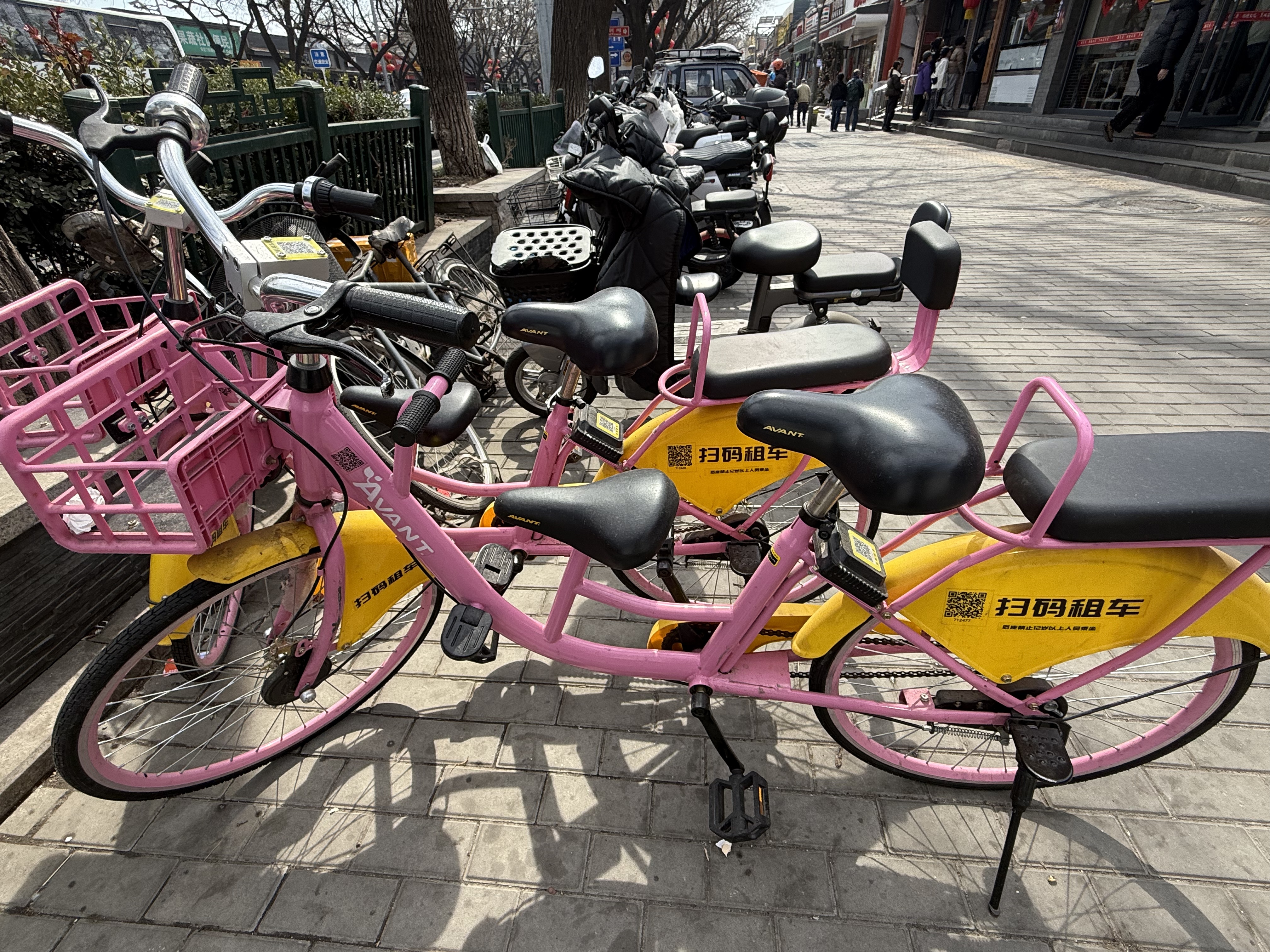 3月19日,记者前往鼓楼东大街、地安门外大街、安定门内大街等游客聚集的街道附近探访,依旧能看到一些零散停放着的“亲子单车”。