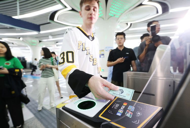 2025年6月15日起,北京城市轨道新增支持境外发行的JCB卡和境内外发行的美国运通卡非接触式拍卡过闸及购补票功能。北京城市轨道成为全球首个全网覆盖中国银联、万事达、维萨、JCB、美国运通五大卡组织支付服务的城市轨道交通系统。图为一名外籍乘客使用美国运通卡拍卡过闸。资料图片/新京报记者 王贵彬 摄