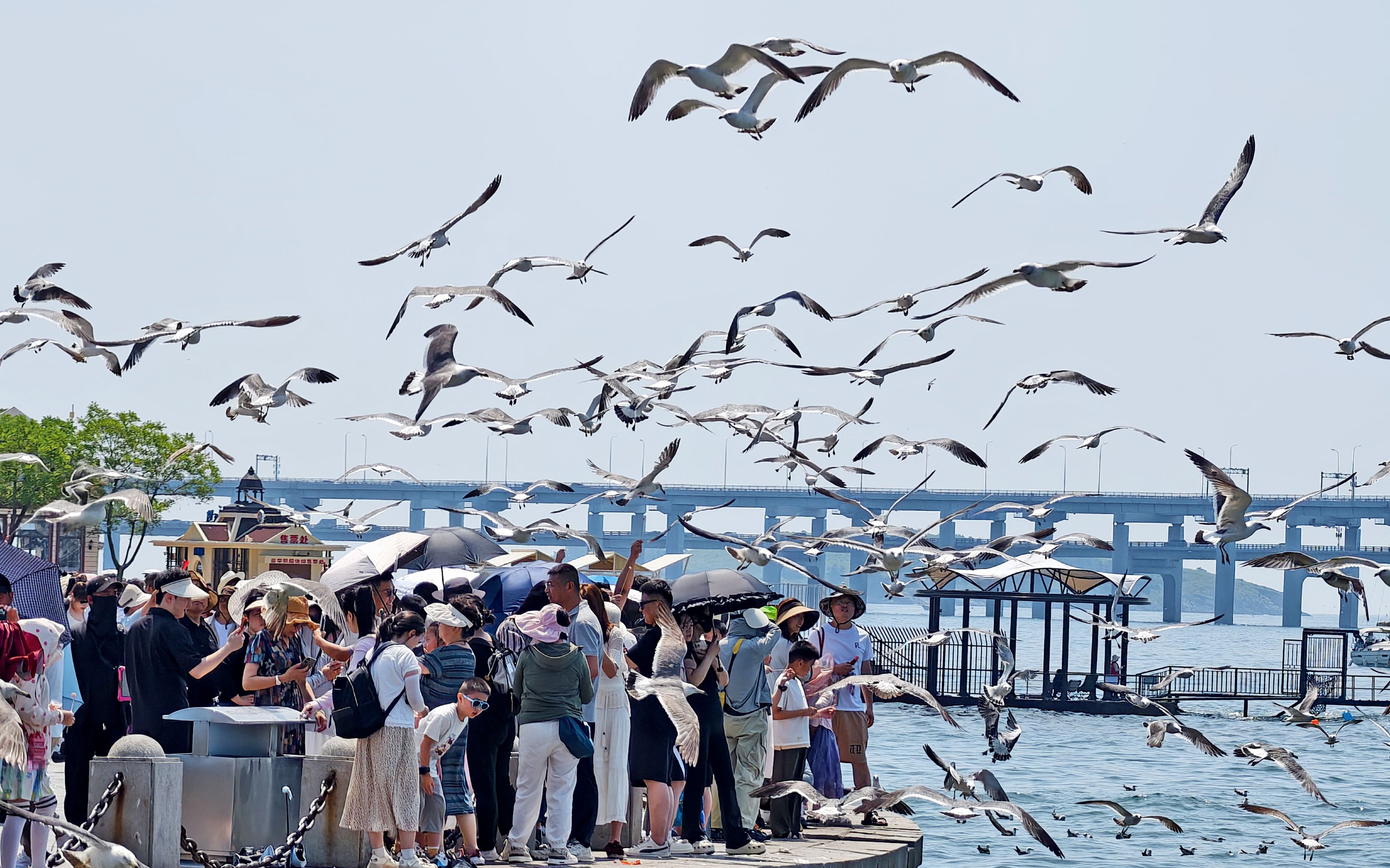 2025年7月,辽宁大连,众多游客在星海湾景区游玩、观赏海鸥。图/IC photo