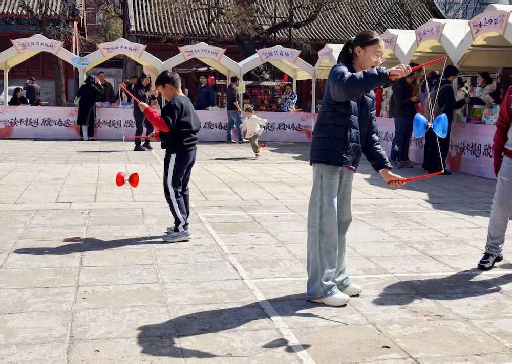 小朋友在“广内文化长廊”创意市集玩空竹。长廊内设有空竹博物馆、文化出版单位及北京蜡果等非遗传承项目展示。