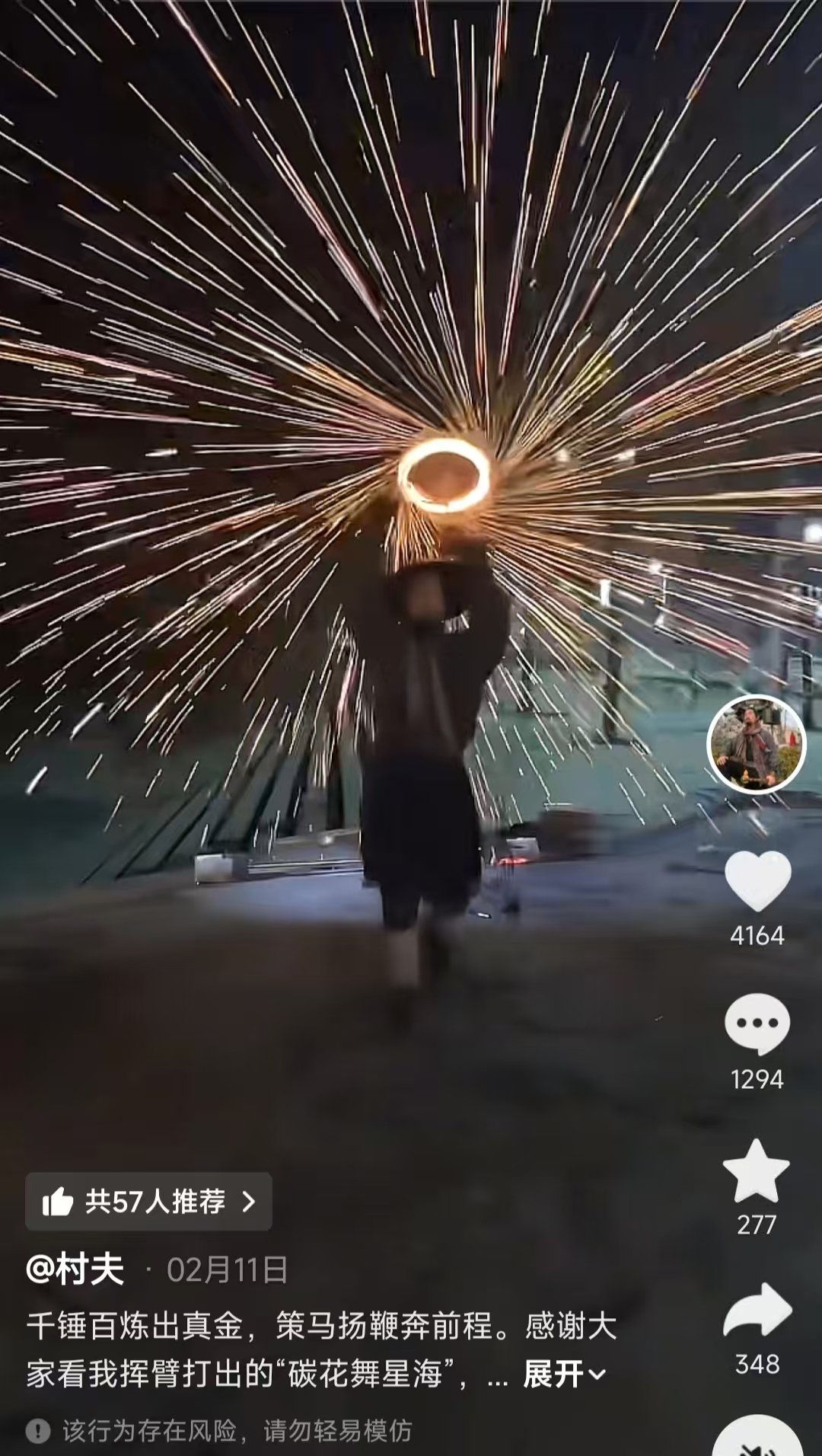 不同于真正的非遗打铁花,要将高温熔化的铁水舀起后打散,村夫这一类直播更像是它的简化版——将钢丝棉烧着后,靠人力或电钻甩出火星。近两年,“非遗”成为抖音重点推广的内容赛道,为了获得推荐,主播们也会挂上“非遗”的标签。村夫是这个赛道上的“顶流”,去年11月底入场,短短两个月,两个账号积累了14万粉丝,直播在线人数有时能到几千人,别的打铁花直播间通常只有几十甚至几人。
