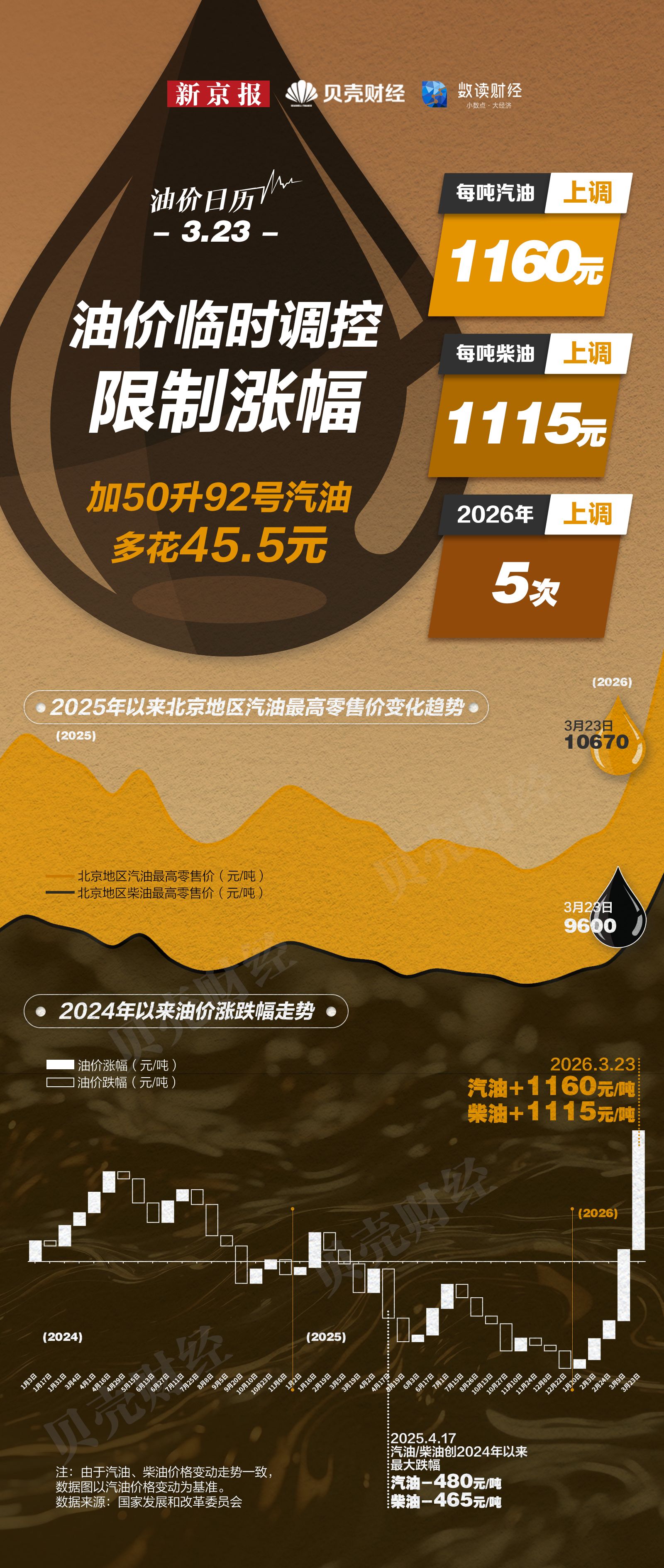 据国家发展和改革委员会(简称“国家发展改革委”)消息,根据现行价格机制计算,3月23日国内汽、柴油价格(标准品)每吨分别应上调2205元、2120元,调控后实际上调1160元、1115元。
