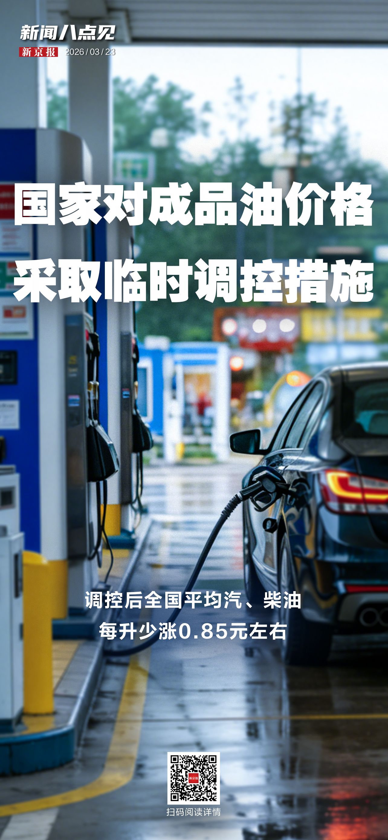3月23日24时,国内成品油零售价格“五连涨”,国家出手采取临时调控措施限制涨幅,调控后全国平均汽、柴油每升少涨0.85元左右。