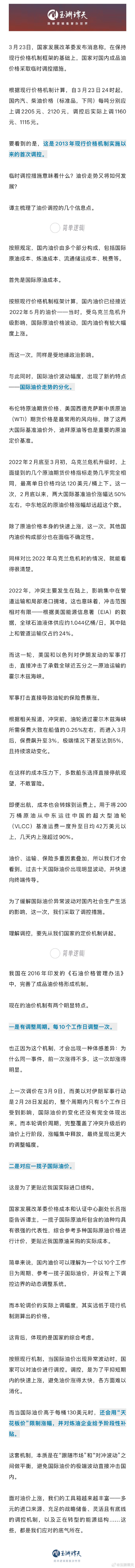 据玉渊谭天消息,3月23日,我国对成品油价格采取临时调控措施。博主梳理了油价调控的几个信息点: