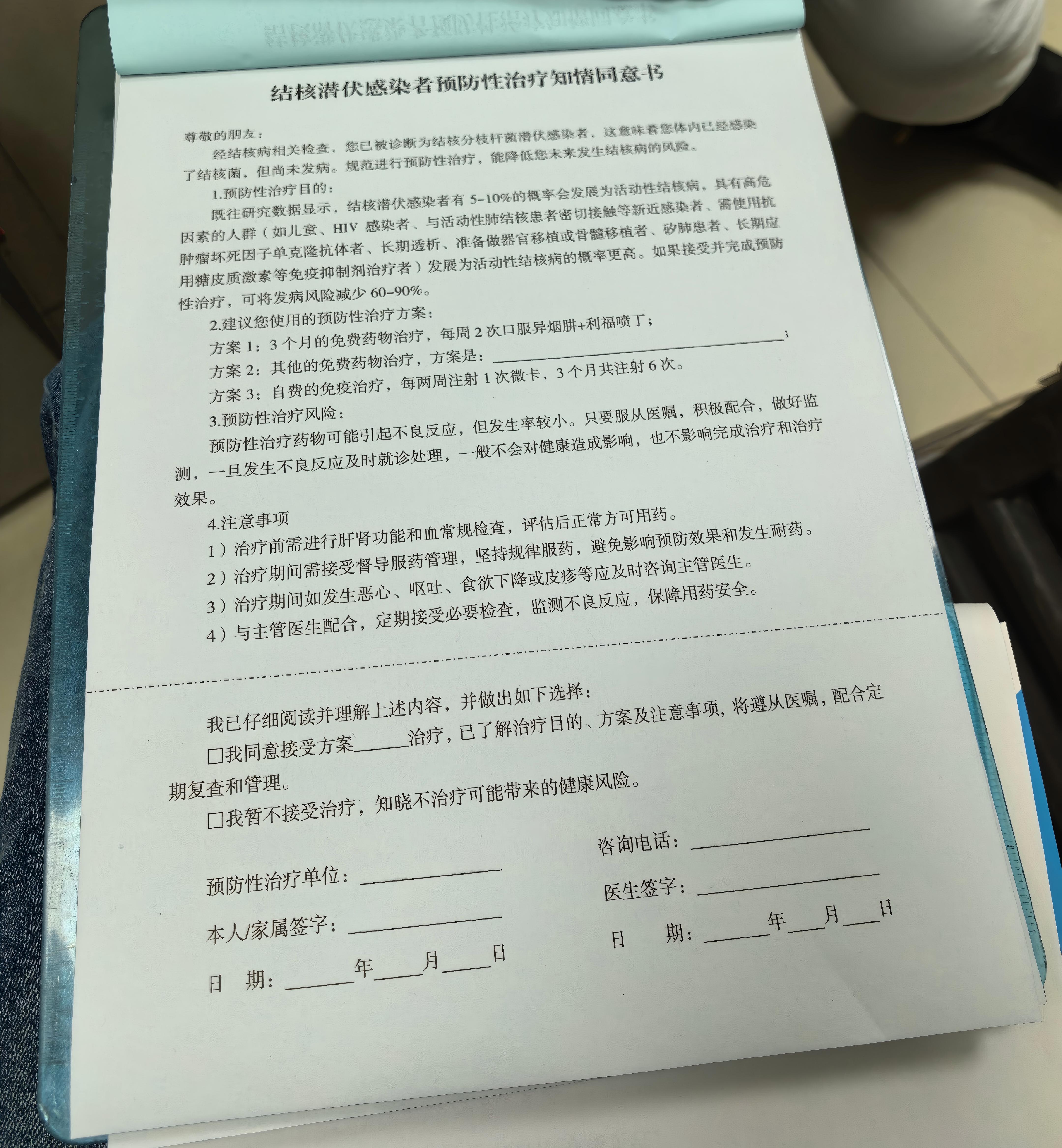 北京航天总医院,接受结核病预防性治疗的患者需签署知情同意书。新京报记者 戴轩 摄