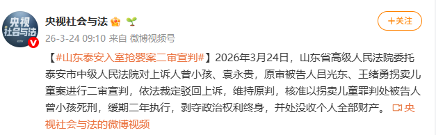 据@央视社会与法 消息,2026年3月24日,山东省高级人民法院委托泰安市中级人民法院对上诉人曾小孩、袁永贵,原审被告人吕光东、王绪勇拐卖儿童案进行二审宣判,依法裁定驳回上诉,维持原判,核准以拐卖儿童罪判处被告人曾小孩死刑,缓期二年执行,剥夺政治权利终身,并处没收个人全部财产。