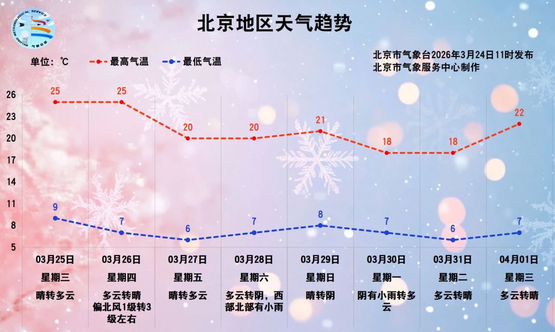 3月25日至4月1日,北京白天最高气温18℃至25℃,夜间最低气温6℃至9℃。