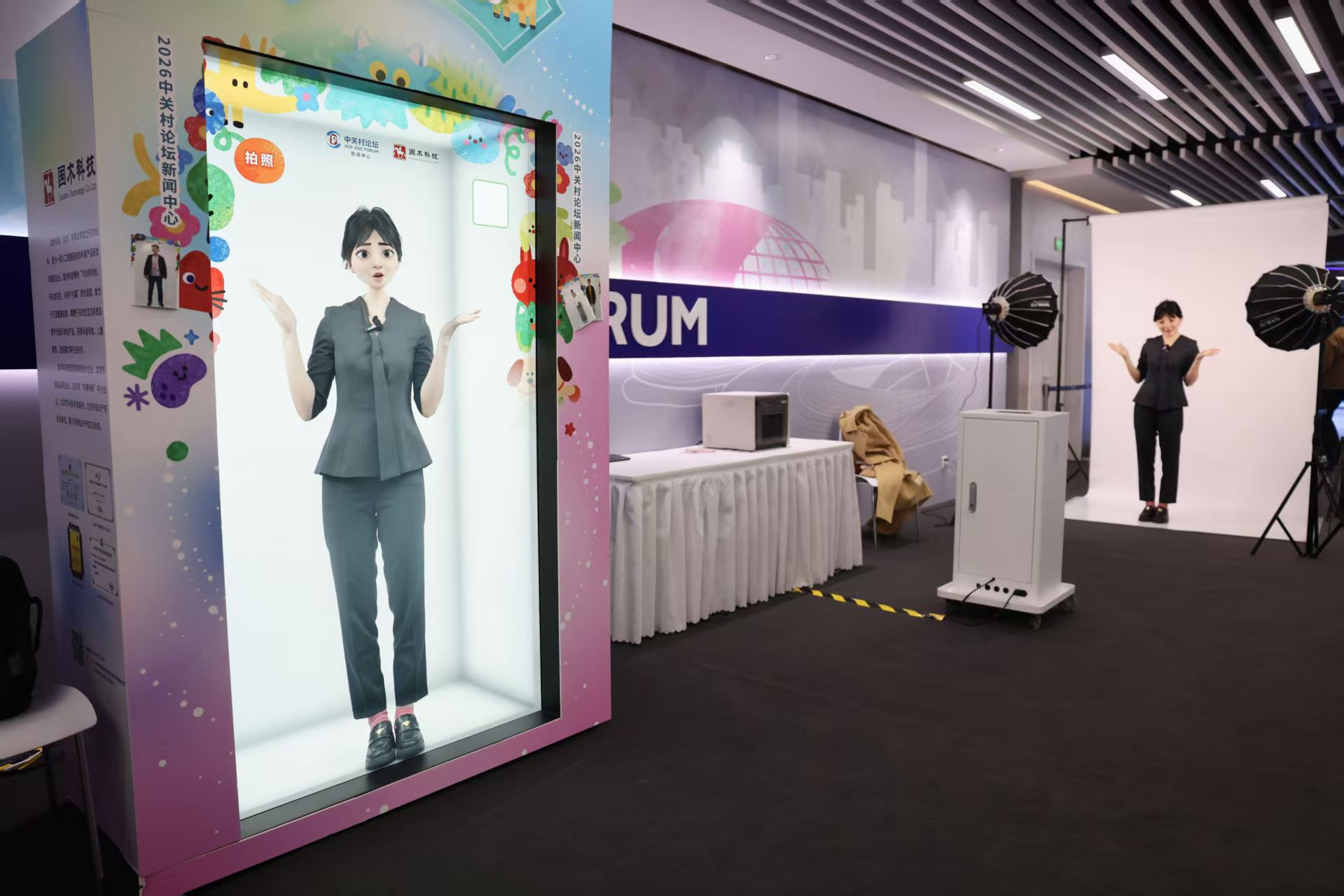 除了前沿的机器人大秀,论坛在参会体验上也下足了功夫。在个性化定制区域,与会者可以选择手绘风格、数字人风格等进行拍摄,借助AI与实时多媒体渲染技术,现场生成带有个人形象的专属冰箱贴作为留念。论坛现场通过真人实拍模式自动捕捉参会者精彩瞬间,智能剪辑生成专属参会Vlog,用镜头为参会者记录下独特的科技之旅。