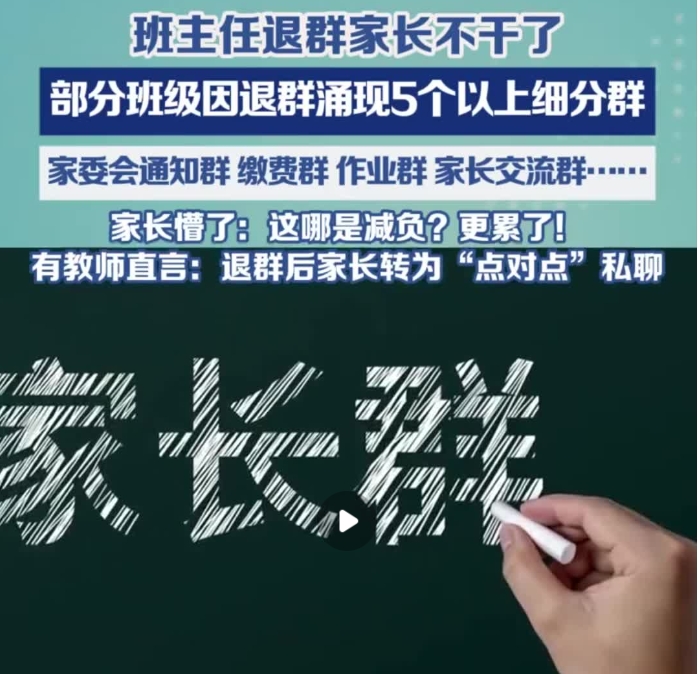 更离谱的是,老师一退,有些班级一夜之间冒出了五个以上的群,家委会通知群、缴费群、作业群、活动策划群、家长交流群……每天早上一睁眼,先挨个群翻一遍,生怕漏掉一条通知。对此,家长们吐槽:这哪是减负啊,这是更累了!