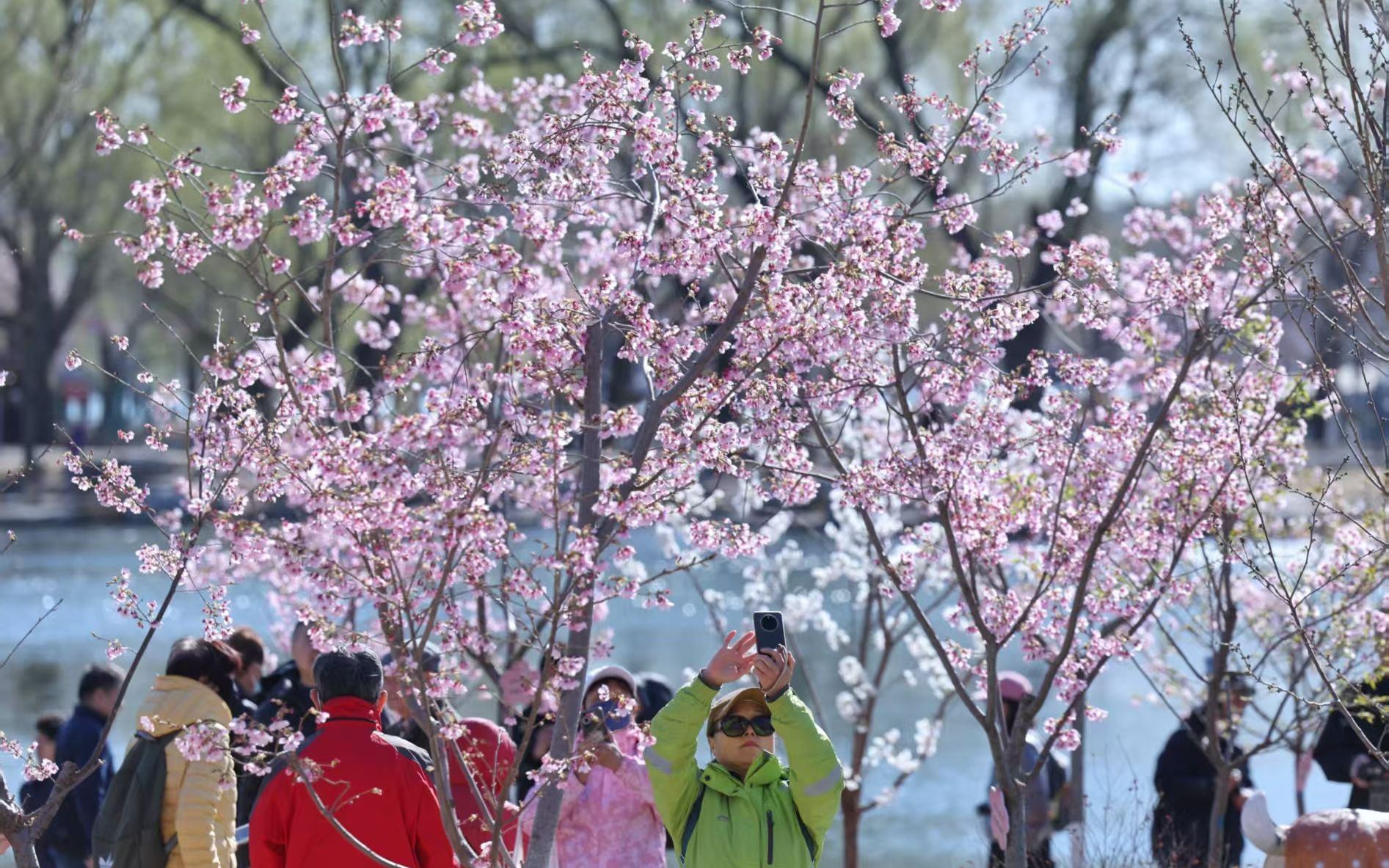 2026年3月18日,玉渊潭公园,游客欣赏提前开放的促培早樱。新京报记者 薛珺 摄