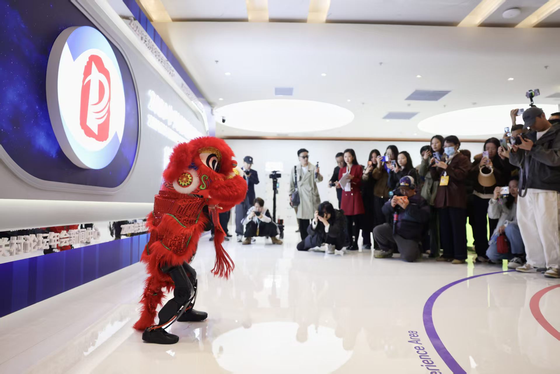 中关村论坛新闻中心,媒体在观看机器人舞狮。新京报记者 浦峰 摄