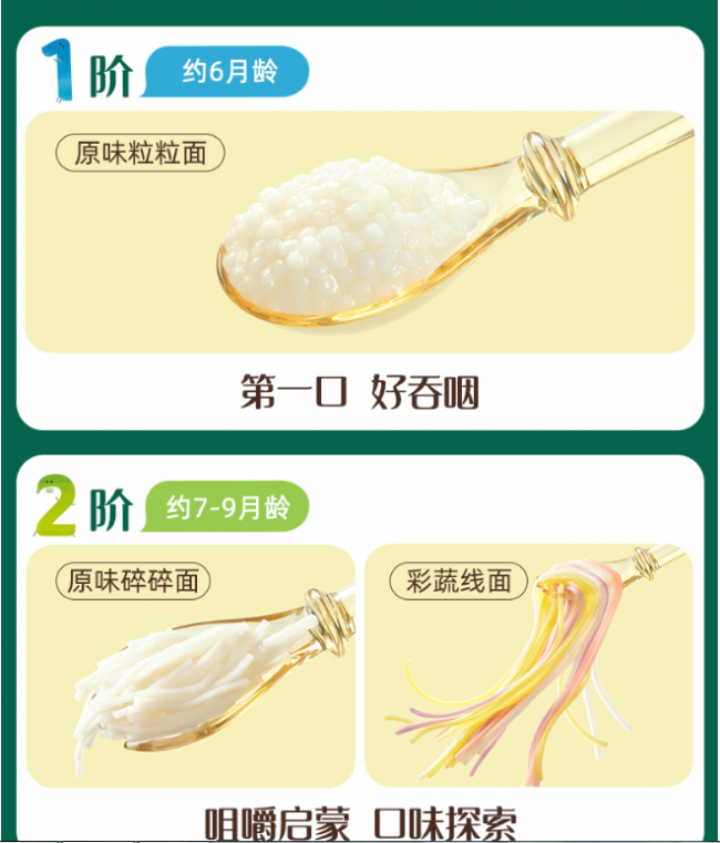 1.独创“科学5阶喂养体系”,1阶粒粒面专为6个月宝宝设计,采用1毫米超细颗粒,完美适配初添辅食宝宝的吞咽能力