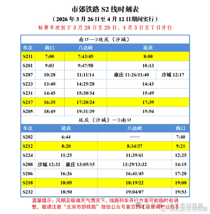 新京报讯 据北京市郊铁路消息,为满足乘客春季踏青出行需求,2026年3月26日至4月12日期间,S2线列车运行图调整,清明假期前一个周末(3月28日、29日)、清明假期及前后一天(4月3日-7日)开行7对列车,其余日期开行5对列车。