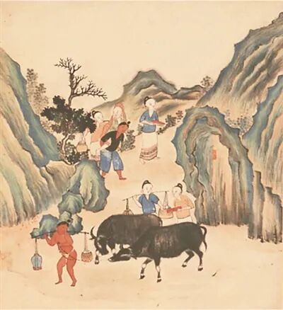 清代佚名《琼黎风俗图》“婚聘图”局部。