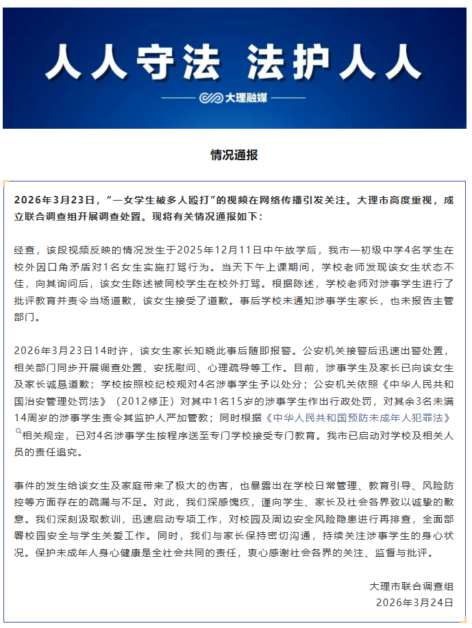 2026年3月23日14时许,该女生家长知晓此事后随即报警。公安机关接警后迅速出警处置,相关部门同步开展调查处置、安抚慰问、心理疏导等工作。目前,涉事学生及家长已向该女生及家长诚恳道歉;学校按照校纪校规对4名涉事学生予以处分;公安机关依照《中华人民共和国治安管理处罚法》(2012修正)对其中1名15岁的涉事学生作出行政处罚,对其余3名未满14周岁的涉事学生责令其监护人严加管教;同时根据《中华人民共和国预防未成年人犯罪法》相关规定,已对4名涉事学生按程序送至专门学校接受专门教育。大理市已启动对学校及相关人员的责任追究。