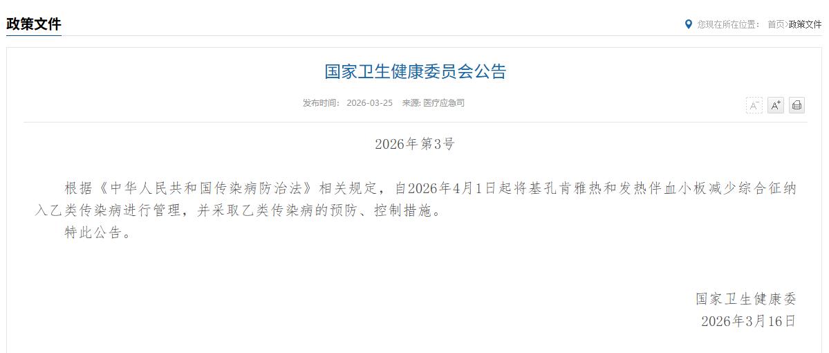 为进一步科学规范开展疫情防控工作,切实保障人民群众生命安全和身体健康,国家卫生健康委决定,自2026年4月1日起将基孔肯雅热纳入《中华人民共和国传染病防治法》规定的乙类传染病进行管理,并采取乙类传染病的预防、控制措施。