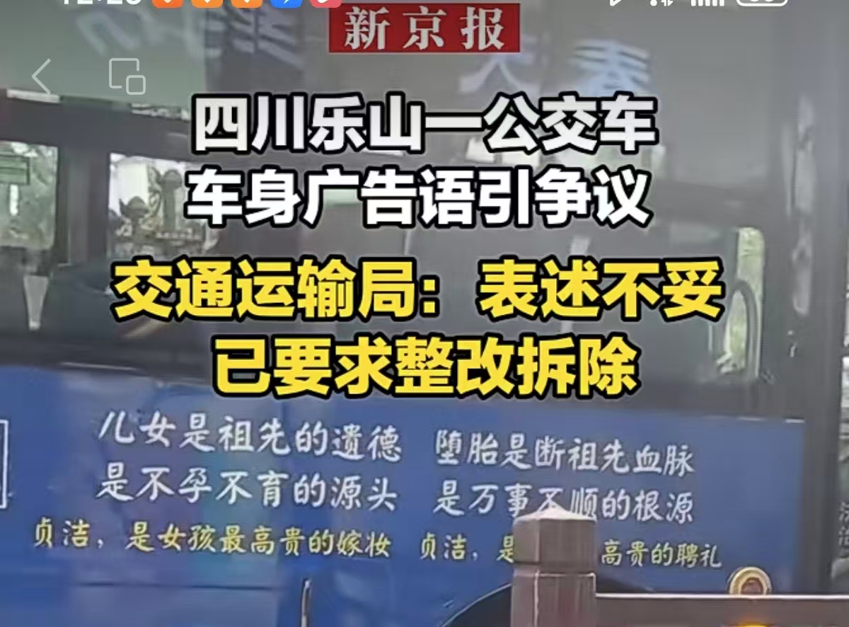 据江西电视台都市频道报道,3月24日,有网友向记者反映,该公交车车身上印有“贞洁是女孩最高贵的嫁妆”“贞洁是男孩最高贵的聘礼”“堕胎是断祖先血脉,是不孕不育的源头,是万事不顺的根源”等字样。另据新京报消息,3月24日下午记者从乐山市井研县交通运输局获悉,该广告语系一家奶粉企业投放,只在一辆公交车上喷印,词语表达上确实不妥,已要求公交公司立即整改拆除。经查,该内容未向行业主管部门报备,当地交通运输部门将加强管理指导。