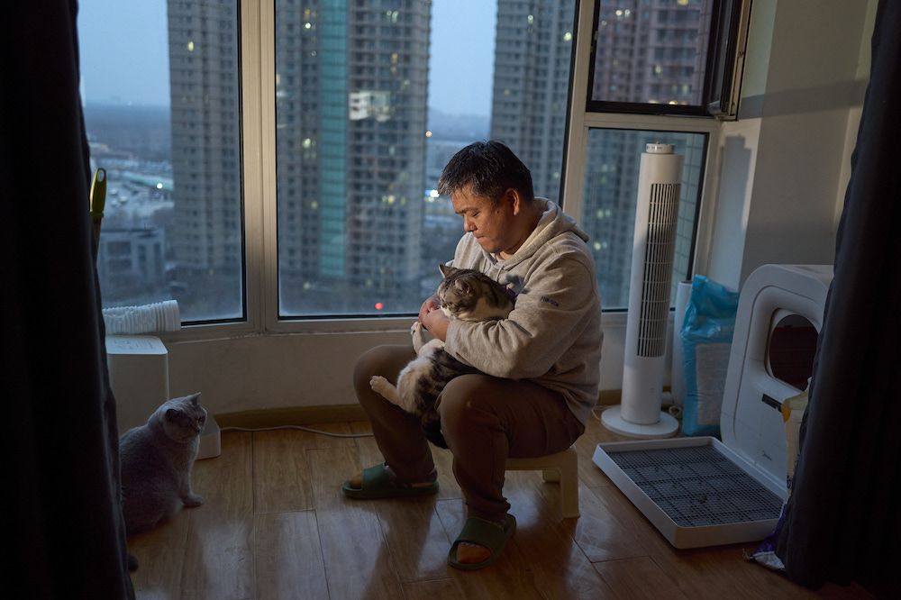 陈建还养了两只小猫,时常给它们梳毛、剪指甲。陈建忙起来时会顾不上自己,却不会忽略他的小猫。他家里的各个角落散落着猫砂、猫抓板、猫屋等各类小猫用具,却没有任何宠物的异味。
