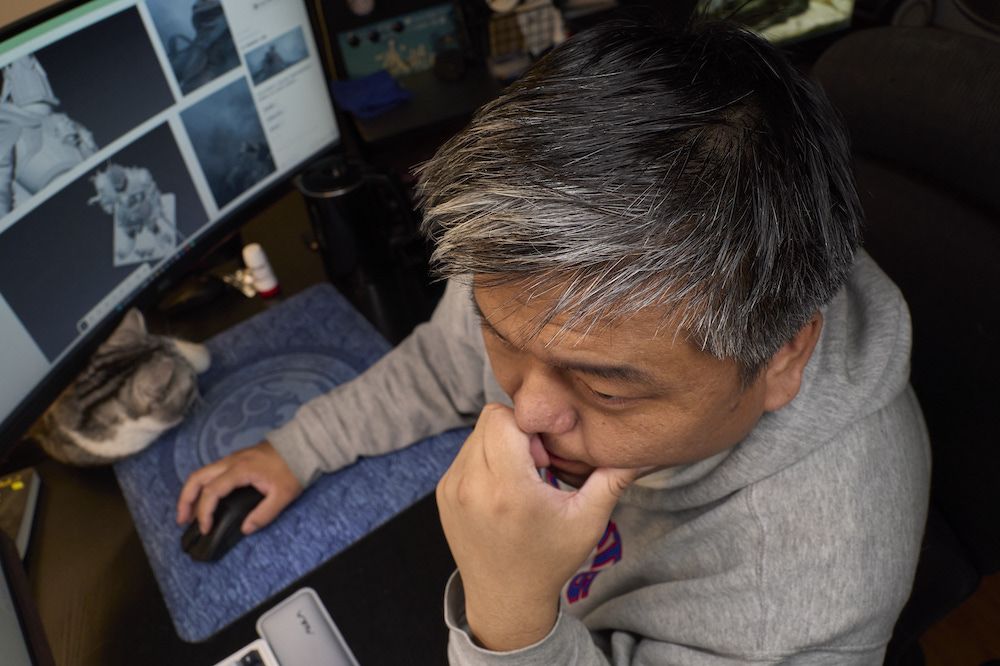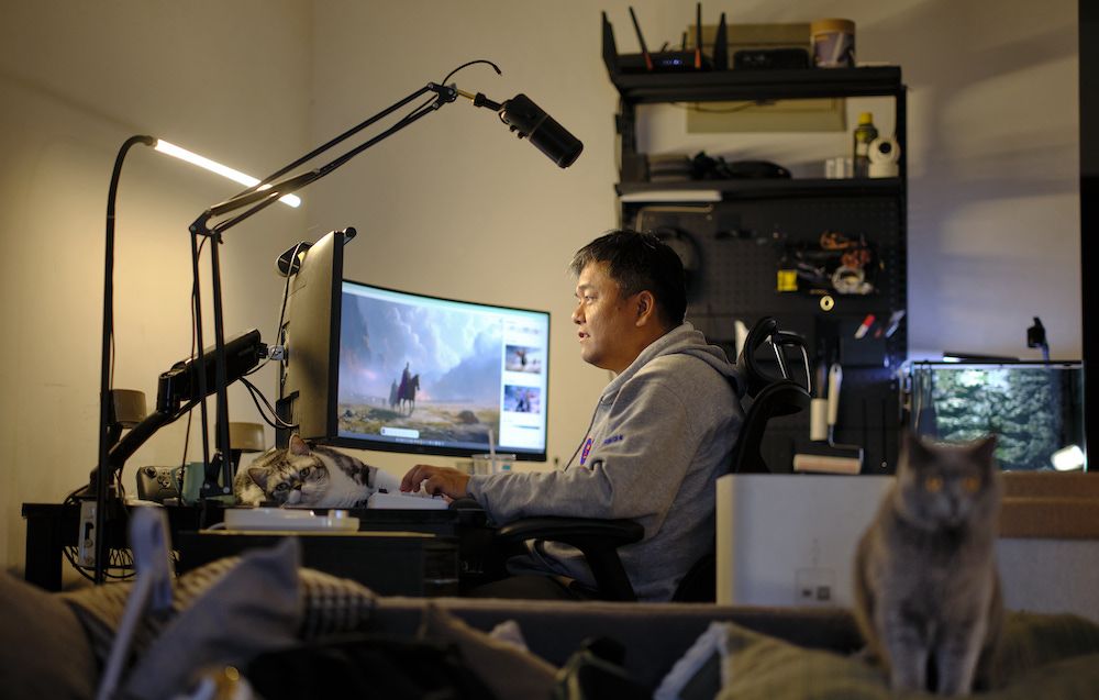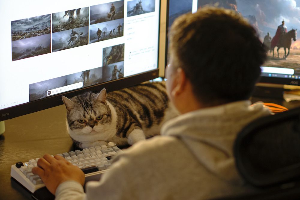 3月14日,陈建正在制作AI视频。他的猫咪总是喜欢趴在他的电脑前。