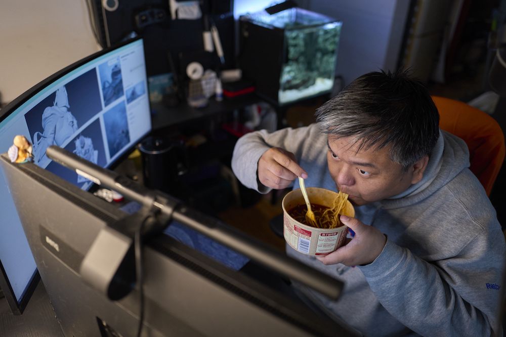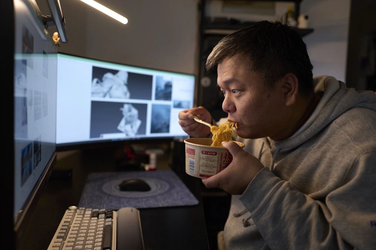 这使得他作息颠倒,生活也不太规律。他买了许多泡面放在家里,常常一边排队等待AI生成,一边抓紧时间吃两口泡面。