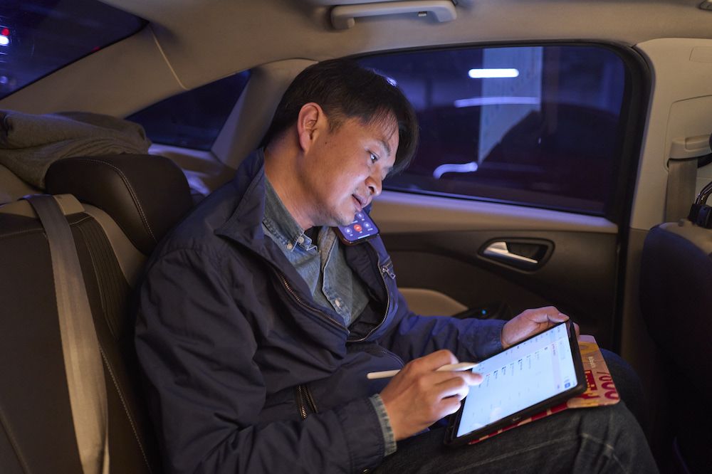3月21日,北京通州区。郑康乐在网约车上开电话会议,与同事沟通VR项目进展。