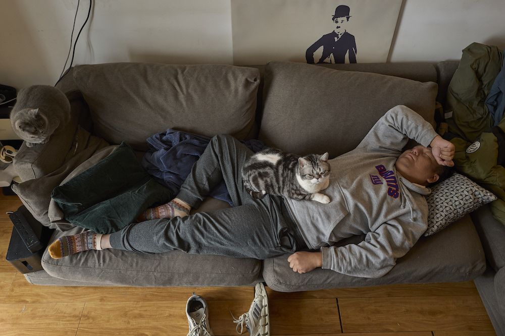 3月21日中午,陈建在沙发上小憩。每天夜里进行AI工作,他的作息时间被打乱。
