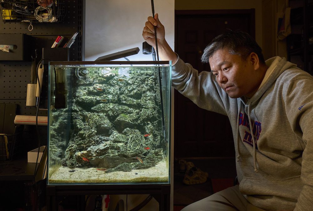 3月14日,陈建在工作间隙清洁鱼缸里的青苔。