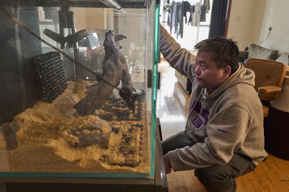 3月21日,河北燕郊陈建家中。陈建看着废弃很久的鱼缸,他打算忙过这一段,再把养鱼的爱好拾起来。