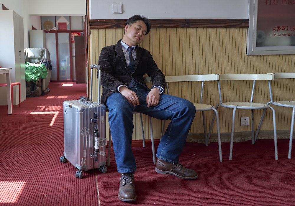 3月14日中午,北京东五环。郑康乐下了飞机便赶到录音棚为VR项目录音。他在等待配音演员的间隙小憩。
