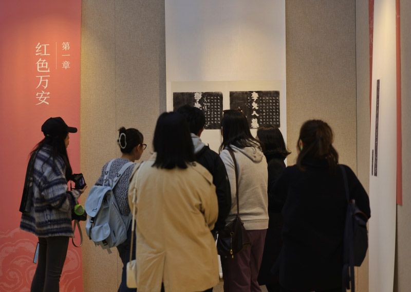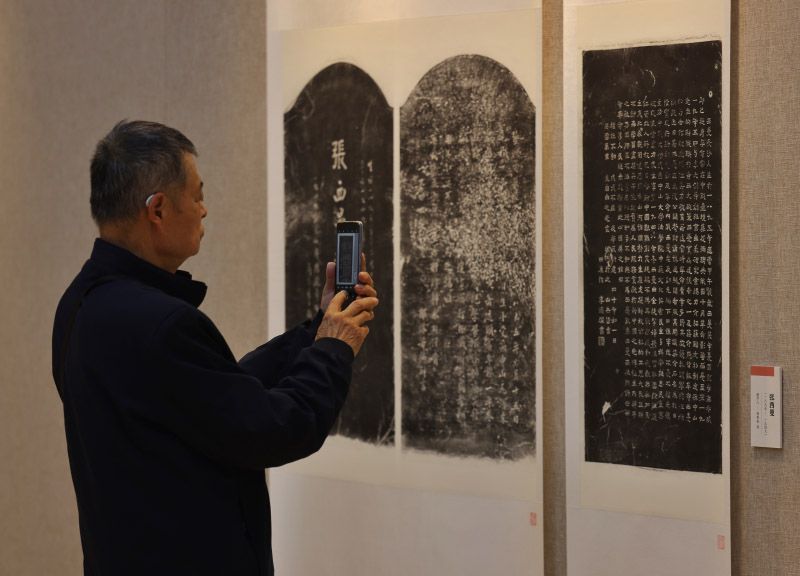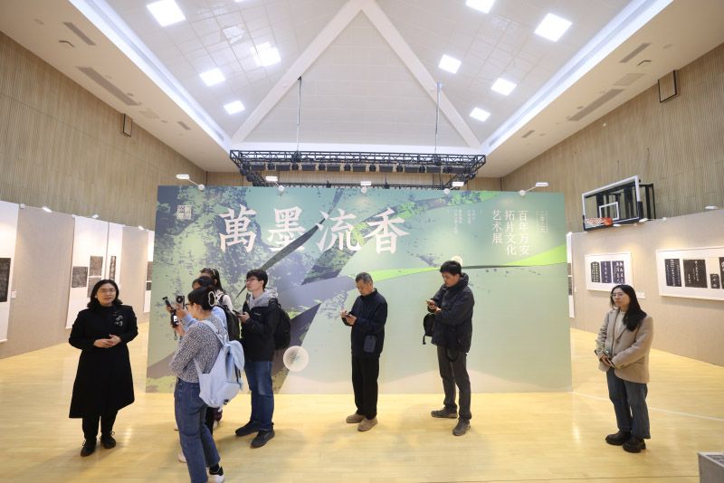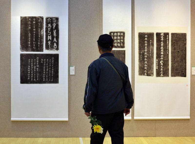 市民观看拓片作品展。现场展示出近百幅优秀的拓片作品,来自四十多位历史名人的碑刻。同时,万安公墓的华表、石狮等建筑构件上的纹样,也被精心拓裱。
