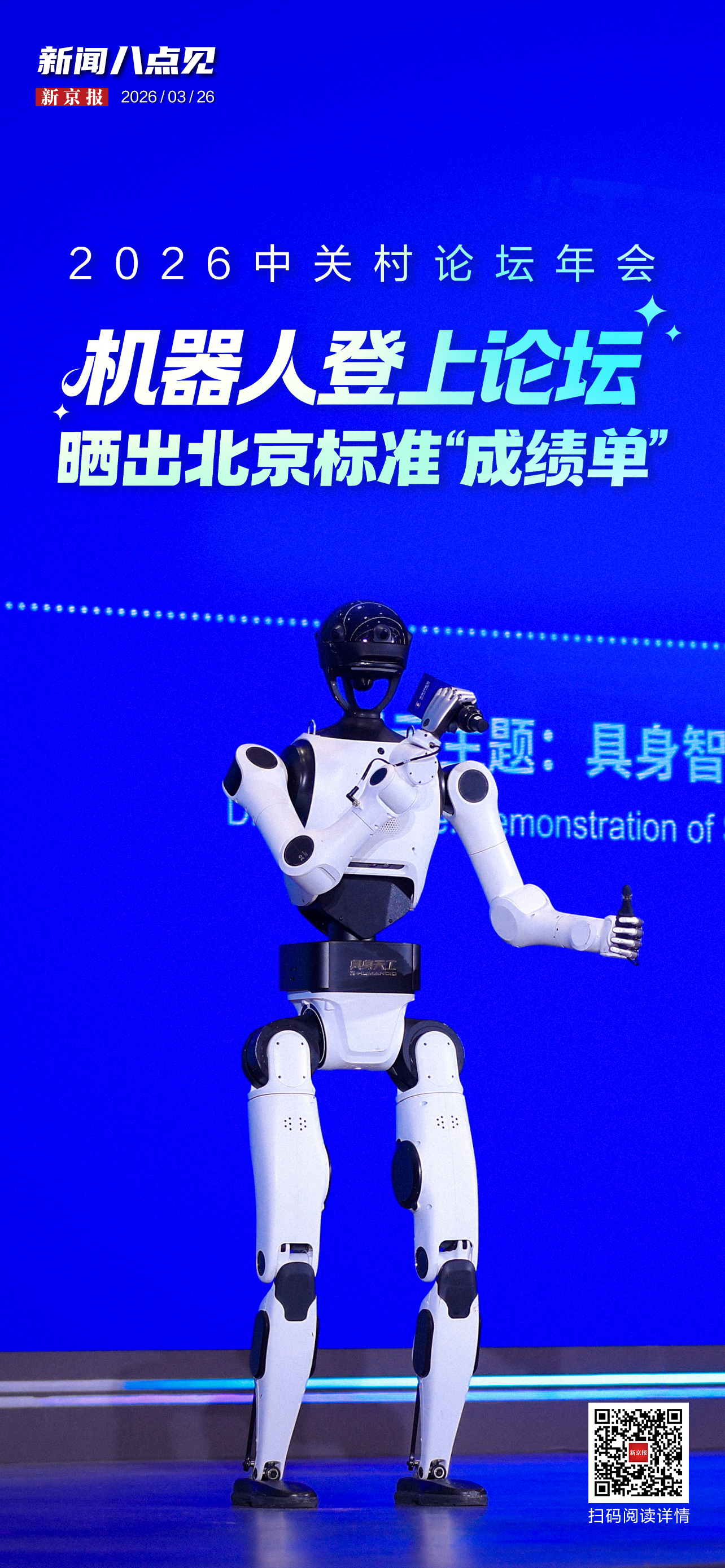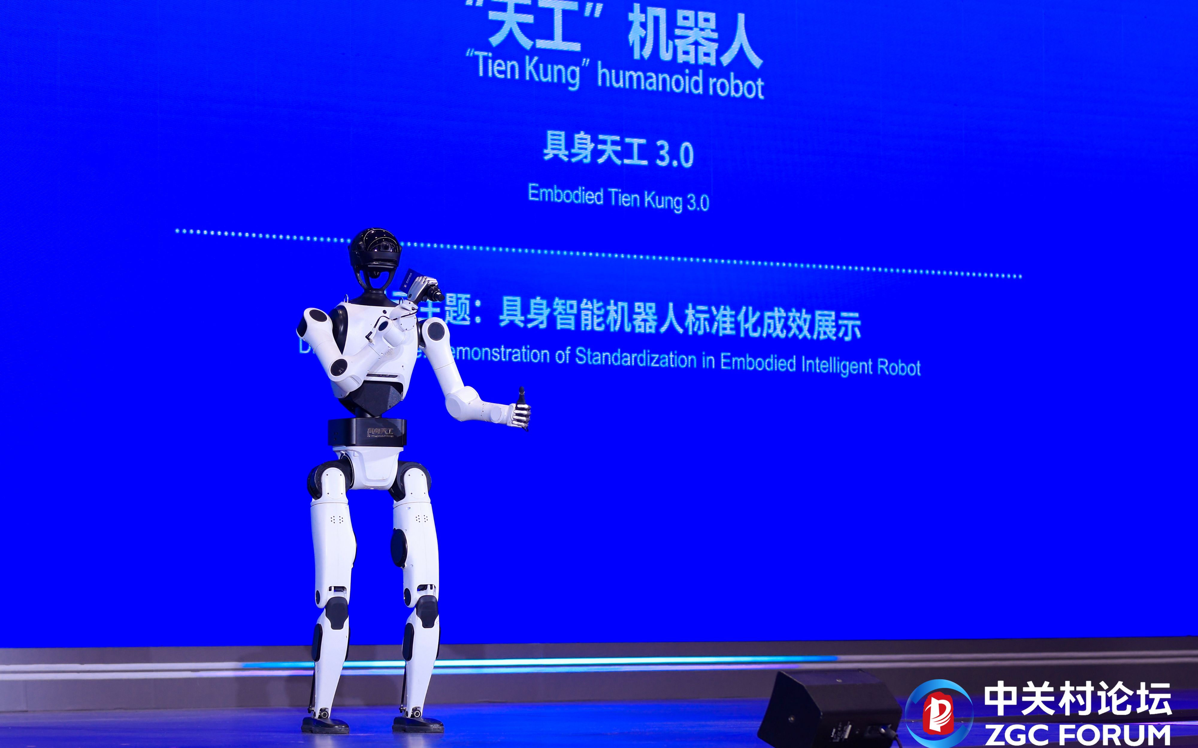 “天工3.0”机器人登上论坛,亲自讲述标准化如何帮它变得更“聪明”——这是2026中关村论坛年会标准化与科技创新发展论坛上的一幕。