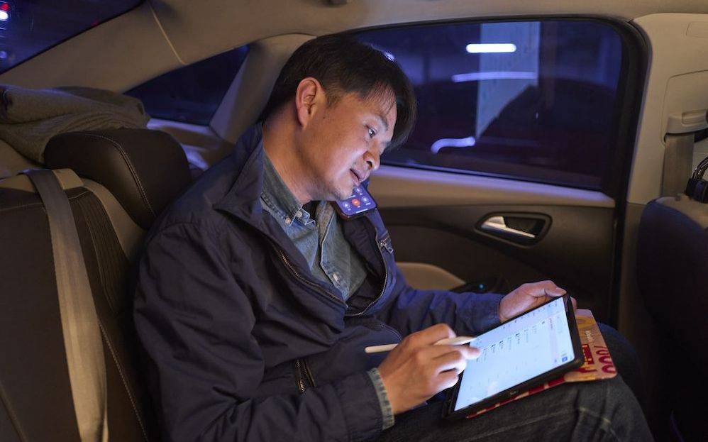 2026年3月21日,北京通州区。郑康乐在网约车上开电话会议,与同事沟通VR项目进展。