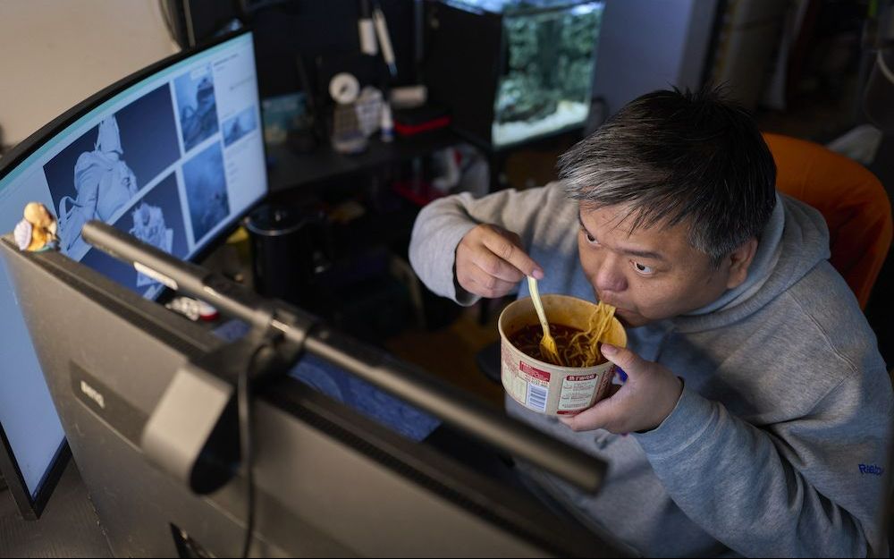 2026年3月21日深夜,河北燕郊陈建家中。陈建一边吃泡面,一边等待着AI生成。